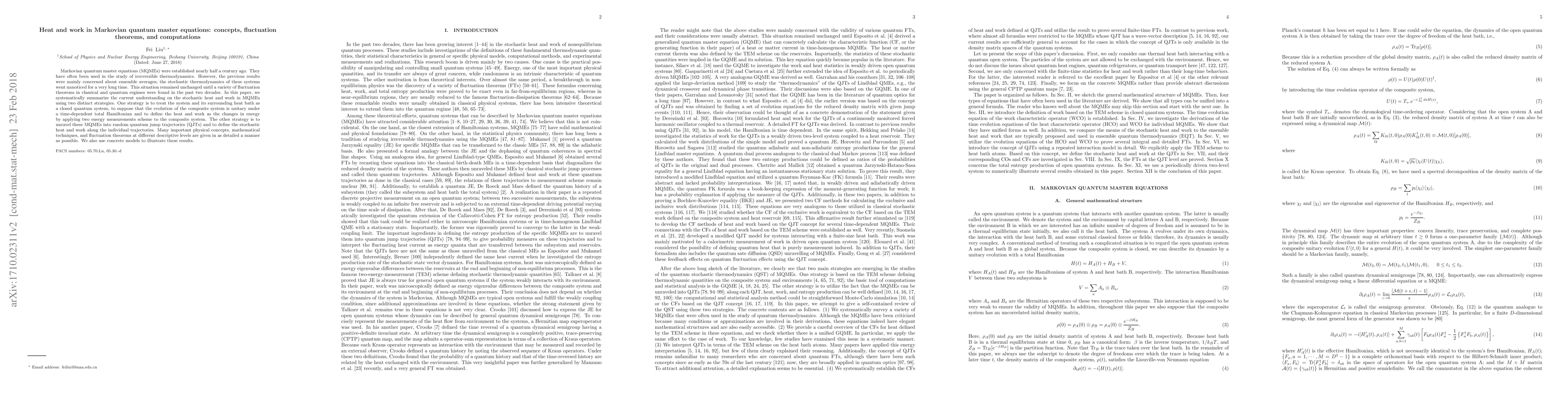 Markovian quantum master equations (MQMEs) were established nearly half a century ago. They have often been used in the study of irreversible thermodynamics. However, the previous results were mainly concerned about ensemble averages; the stochastic thermodynamics of these systems went unnoticed for a very long time. This situation remained unchanged until a variety of fluctuation theorems in classical and quantum regimes were found in the past two decades. In this paper, we systematically summarize the current understanding on the stochastic heat and work in MQMEs using two distinct strategies. One strategy is to treat the system and its surrounding heat bath as a closed quantum system, to suppose that the evolution of the composite system is unitary under a time-dependent total Hamiltonian and to define the heat and work as the changes in energy by applying two energy measurements scheme to the composite system. The other strategy is to unravel these MQMEs into random quantum jump trajectories (QJTs) and to define the stochastic heat and work along the individual trajectories. Many important physical concepts, mathematical techniques, and fluctuation theorems at different descriptive levels are given in as detailed a manner as possible. We also use concrete models to illustrate these results.