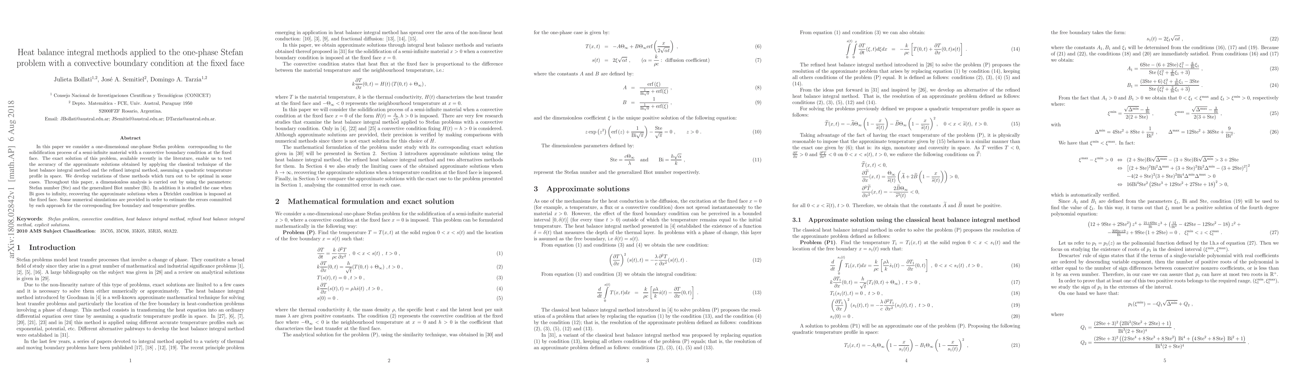 This paper examines the one-phase Stefan problem for solidification with a convective boundary condition, applying heat balance integral methods to approximate solutions. It compares classical and refined integral methods, optimizing them for accuracy, and conducts numerical simulations to estimate error margins.