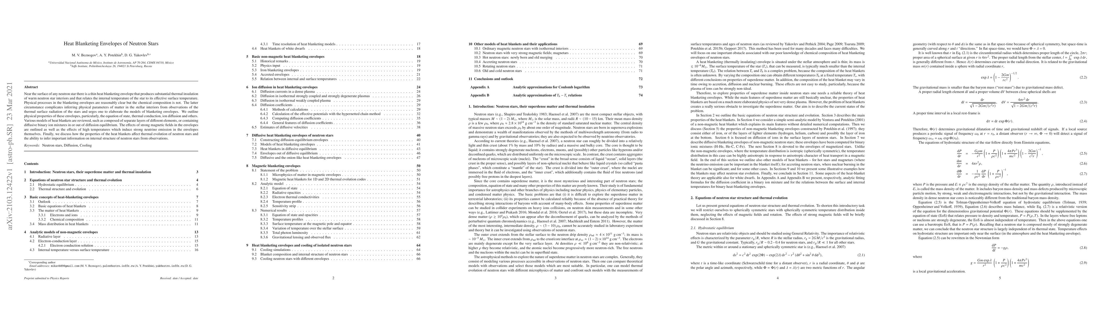 This paper investigates the thin heat blanketing envelopes of neutron stars, which insulate their interiors and link internal temperatures to surface radiation. It reviews various models of these envelopes, including the equation of state, thermal conduction, and effects of magnetic fields and high temperatures, and discusses how these properties influence neutron star thermal evolution and internal structure inference from observations.