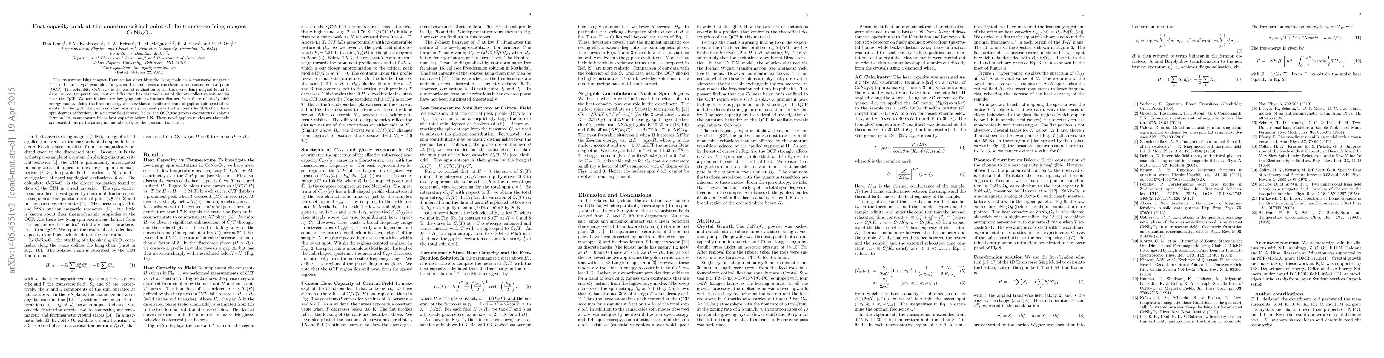 This study investigates the heat capacity anomaly at the quantum critical point of the transverse Ising magnet CoNb$_2$O$_6$, revealing a significant band of gapless spin excitations contributing to a prominent peak in spin entropy. Below 1 K, these excitations exhibit a fermion-like, temperature-linear heat capacity, indicating their role in the quantum transition.