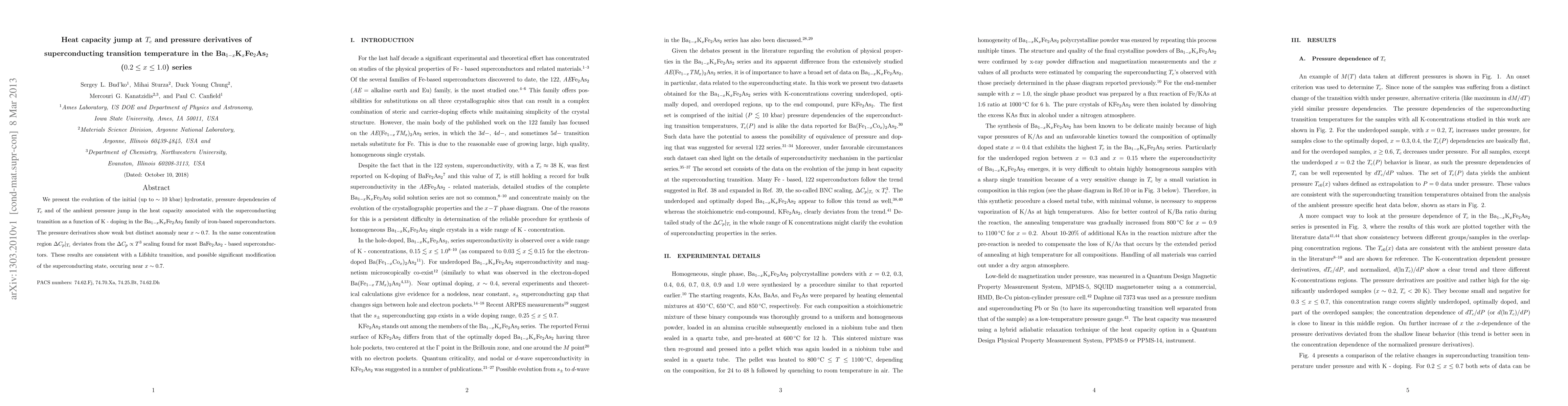 We present the evolution of the initial (up to ~ 10 kbar) hydrostatic, pressure dependencies of Tc and of the ambient pressure jump in the heat capacity associated with the superconducting transition as a function of K - doping in the Ba1-xKxFe2As2 family of iron-based superconductors. The pressure derivatives show weak but distinct anomaly near x ~ 0.7. In the same concentration region Delta Cp at Tc deviates from the Delta Cp ~ T^3 scaling found for most BaFe2As2 - based superconductors. These results are consistent with a Lifshitz transition, and possible significant modification of the superconducting state, occurring near x ~ 0.7.