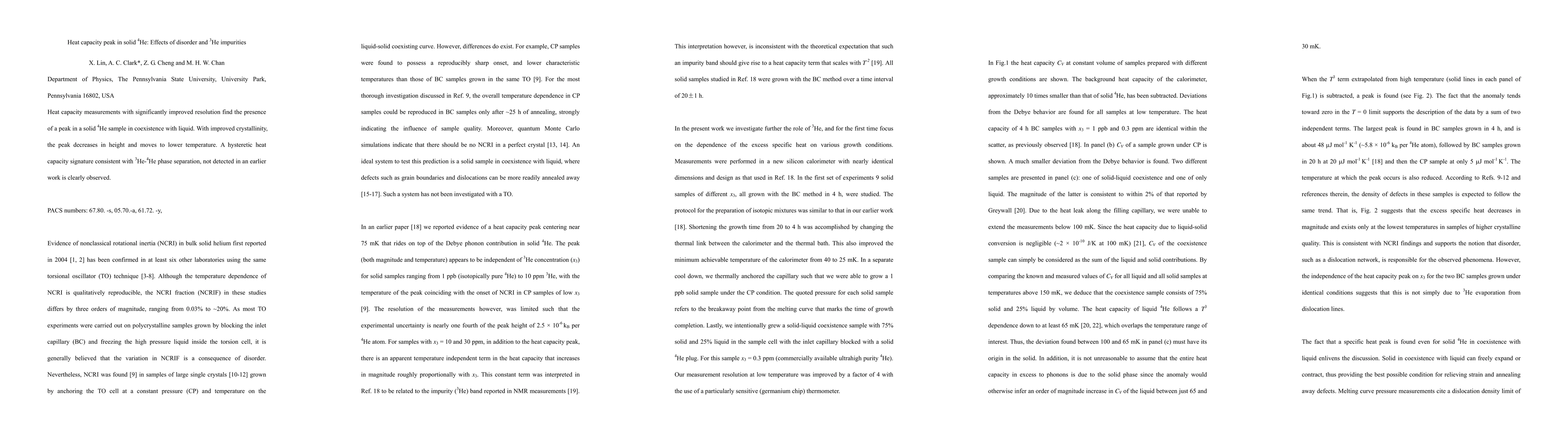 Heat capacity measurements with significantly improved resolution find the presence of a peak in a solid 4He sample in coexistence with liquid. With improved crystallinity, the peak decreases in height and moves to lower temperature. A hysteretic heat capacity signature consistent with 3He-4He phase separation, not detected in an earlier work is clearly observed.