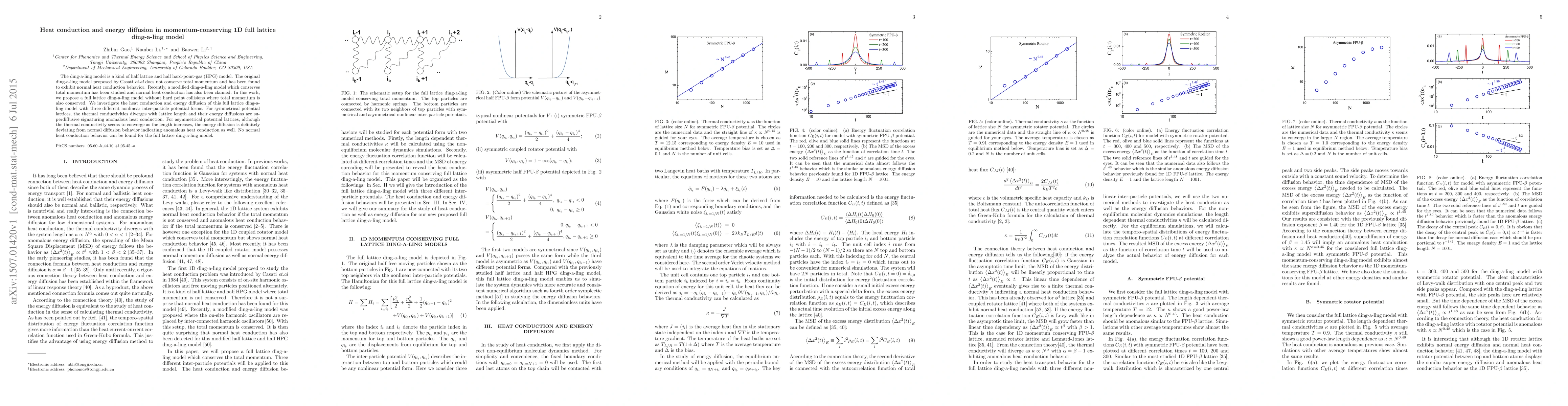 This paper proposes a momentum-conserving full lattice ding-a-ling model and investigates its heat conduction and energy diffusion. It finds that the model exhibits anomalous heat conduction regardless of symmetrical or asymmetrical potentials, with no evidence of normal heat conduction behavior.