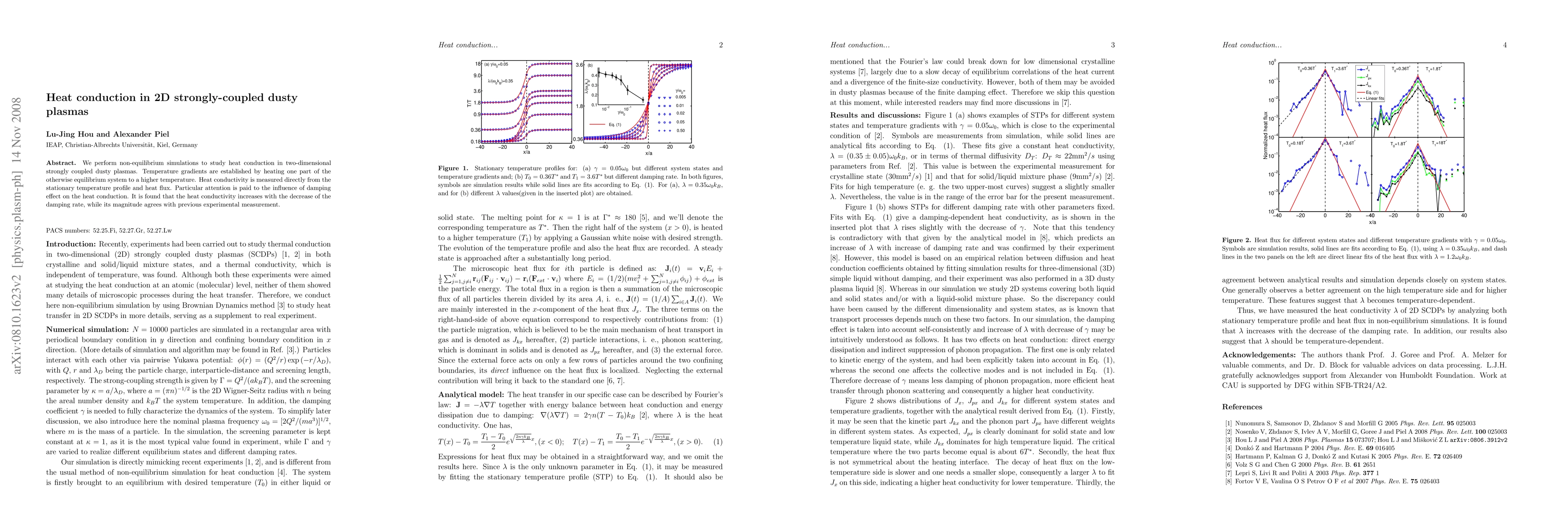 Summary: This study investigates heat conduction in 2D strongly coupled dusty plasmas through non-equilibrium simulations. The research finds that heat conductivity increases with lower damping rates and aligns with prior experimental measurements.