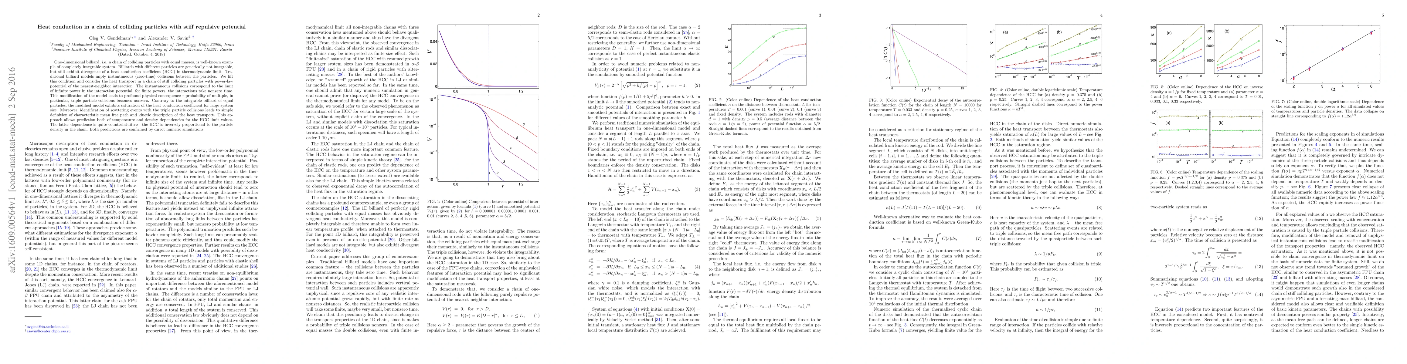 One-dimensional billiard, i.e. a chain of colliding particles with equal masses, is well-known example of completely integrable system. Billiards with different particles are generically not integrable, but still exhibit divergence of a heat conduction coefficient (HCC) in thermodynamic limit. Traditional billiard models imply instantaneous (zero-time) collisions between the particles. We lift this condition and consider the heat transport in a chain of stiff colliding particles with power-law potential of the nearest-neighbor interaction. The instantaneous collisions correspond to the limit of infinite power in the interaction potential; for finite powers, the interactions take nonzero time. This modification of the model leads to profound physical consequence -- probability of multiple, in particular, triple particle collisions becomes nonzero. Contrary to the integrable billiard of equal particles, the modified model exhibits saturation of the heat conduction coefficient for large system size. Moreover, identification of scattering events with the triple particle collisions leads to simple definition of characteristic mean free path and kinetic description of the heat transport. This approach allows prediction both of temperature and density dependencies for the HCC limit values. The latter dependence is quite counterintuitive - the HCC is inversely proportional to the particle density in the chain. Both predictions are confirmed by direct numeric simulations.