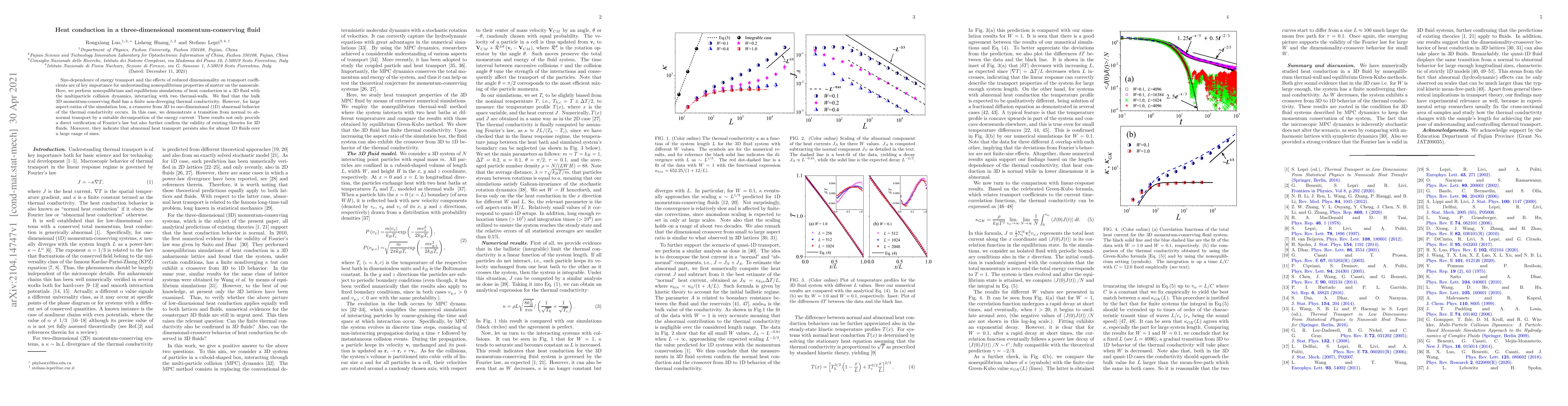 This paper investigates heat conduction in a three-dimensional momentum-conserving fluid using simulations, revealing a finite thermal conductivity in bulk 3D fluids. It finds a crossover to abnormal 1D thermal conductivity for large aspect-ratios, confirming Fourier's law and indicating abnormal heat transport in quasi-1D systems.