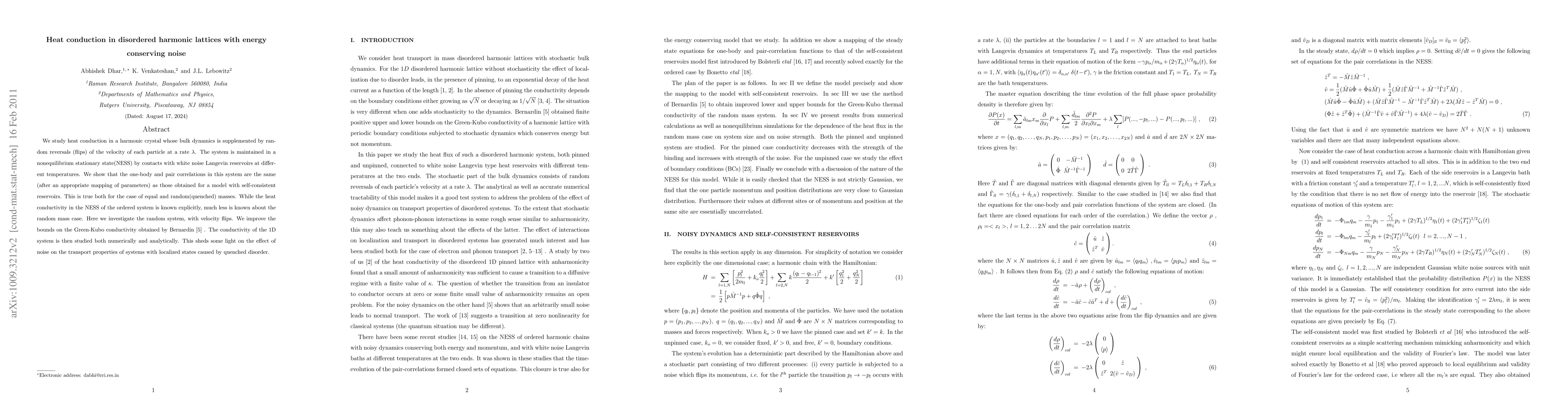 We study heat conduction in a harmonic crystal whose bulk dynamics is supplemented by random reversals (flips) of the velocity of each particle at a rate $\lambda$. The system is maintained in a nonequilibrium stationary state(NESS) by contacts with Langevin reservoirs at different temperatures. We show that the one-body and pair correlations in this system are the same (after an appropriate mapping of parameters) as those obtained for a model with self-consistent reservoirs. This is true both for the case of equal and random(quenched) masses. While the heat conductivity in the NESS of the ordered system is known explicitly, much less is known about the random mass case. Here we investigate the random system, with velocity flips. We improve the bounds on the Green-Kubo conductivity obtained by C.Bernardin. The conductivity of the 1D system is then studied both numerically and analytically. This sheds some light on the effect of noise on the transport properties of systems with localized states caused by quenched disorder.