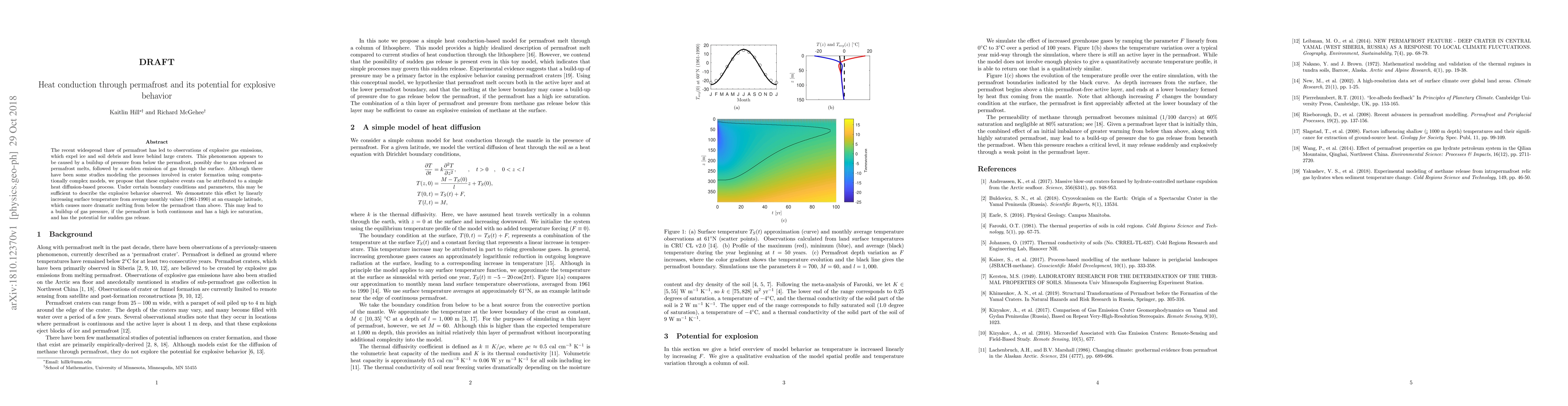 This paper investigates the heat conduction through thawing permafrost leading to explosive gas emissions, proposing a simple heat diffusion-based model to explain the phenomenon. The study demonstrates that increased surface temperatures can cause significant melting below the permafrost, leading to gas pressure buildup and potential for explosive gas release.