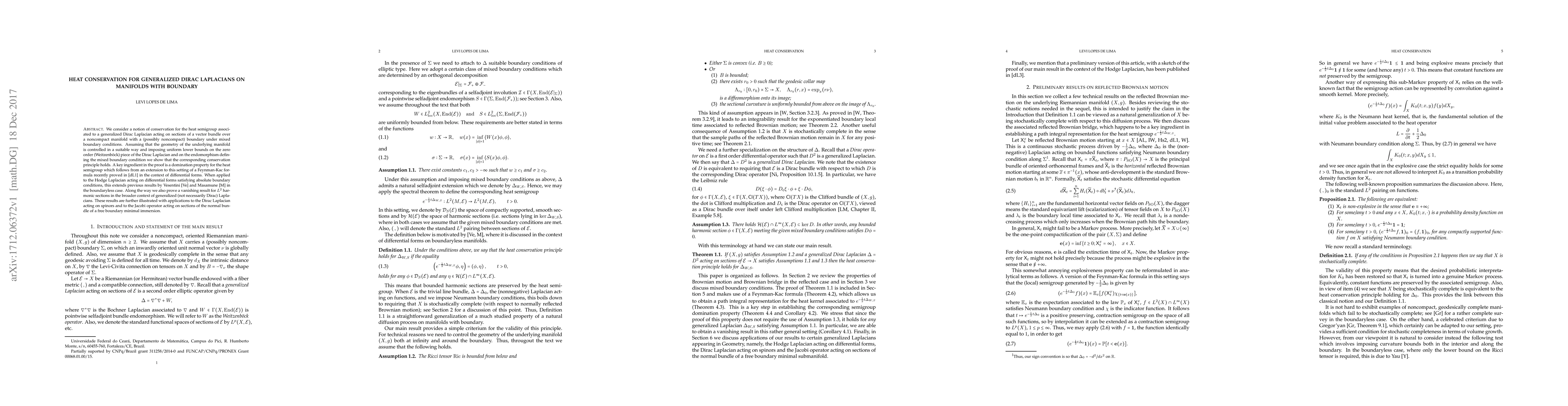 This research paper establishes a conservation principle for heat semigroups on manifolds with boundary, extending previous results to generalized Dirac Laplacians and improving the control of the underlying geometry.