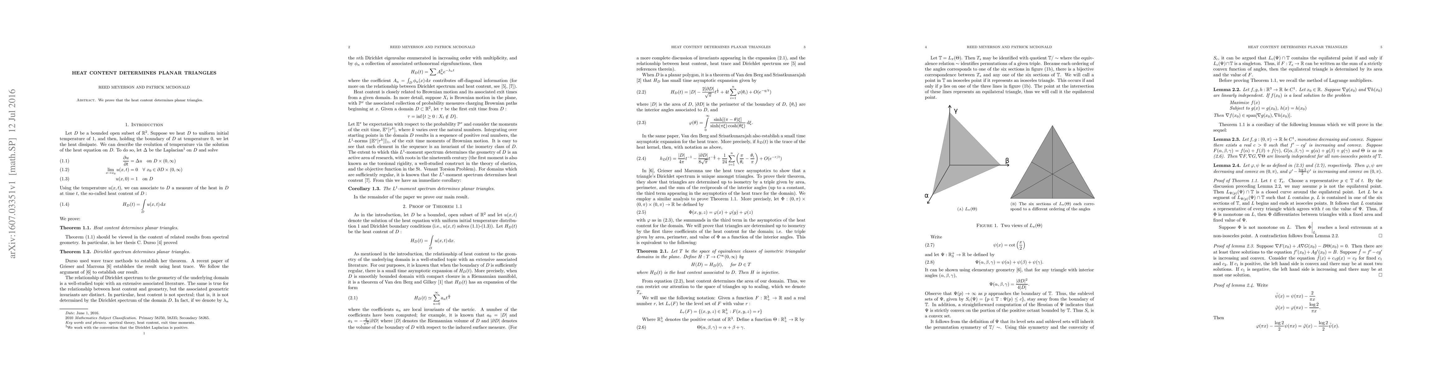 Summary: This paper demonstrates that the heat content, a measure related to the distribution of heat in a geometric shape, uniquely identifies planar triangles. Thus, heat content serves as a distinctive characteristic for determining the shape of planar triangles.