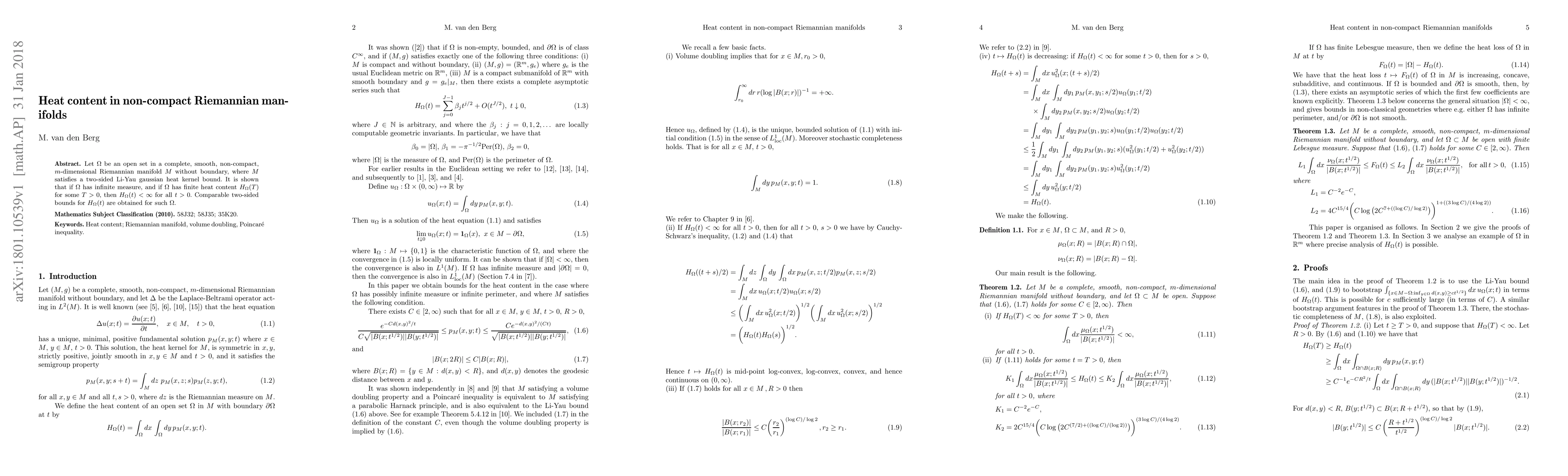 Let $\Omega$ be an open set in a complete, smooth, non-compact, $m$-dimensional Riemannian manifold $M$ without boundary, where $M$ satisfies a two-sided Li-Yau gaussian heat kernel bound. It is shown that if $\Omega$ has infinite measure, and if $\Omega$ has finite heat content $H_{\Omega}(T)$ for some $T>0$, then $H_{\Omega}(t)<\infty$ for all $t>0$. Comparable two-sided bounds for $H_{\Omega}(t)$ are obtained for such $\Omega$.