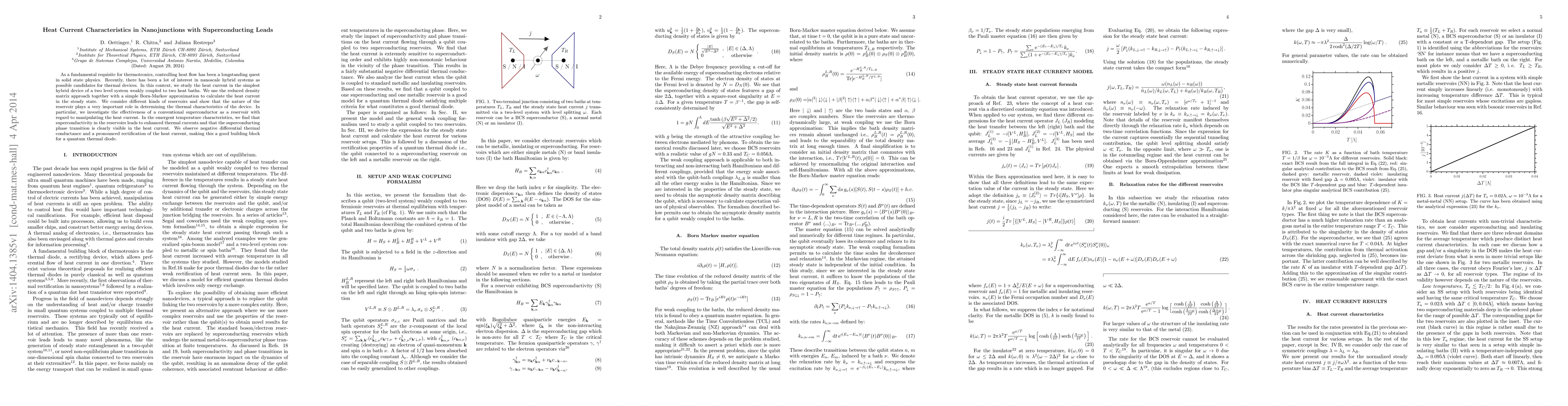 This paper explores heat current characteristics in nanoscale hybrid systems, specifically a two-level system connected to superconducting leads. It finds that superconducting reservoirs enhance thermal currents and exhibit negative differential thermal conductance, suggesting potential for quantum thermal devices like thermal diodes.