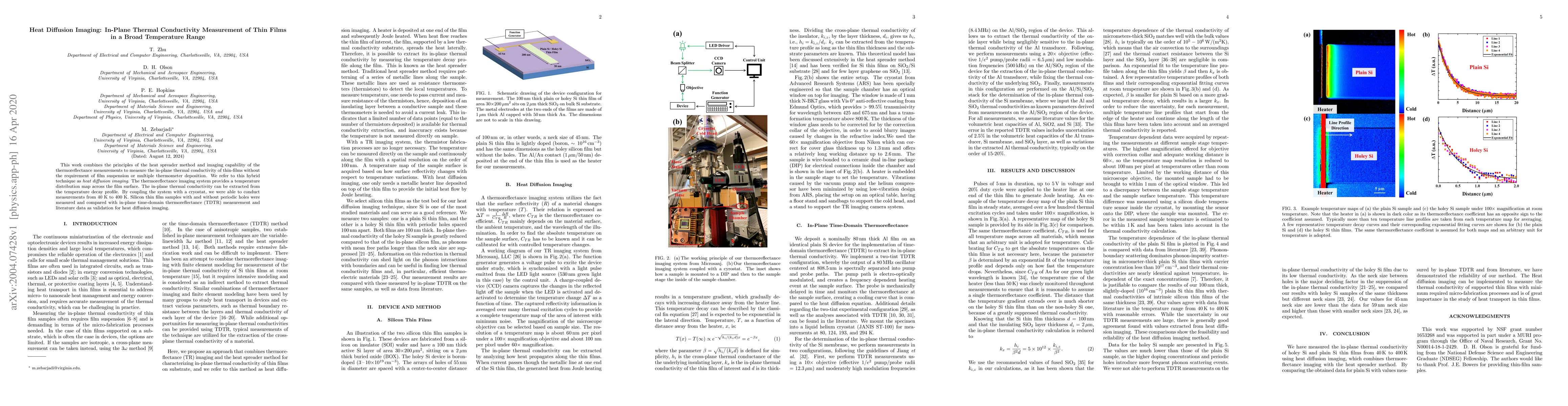 This paper introduces heat diffusion imaging, a novel method combining heat spreader and thermoreflectance imaging to measure in-plane thermal conductivity of thin films over a wide temperature range from 40 K to 400 K, validated by comparing results with established techniques and literature data.