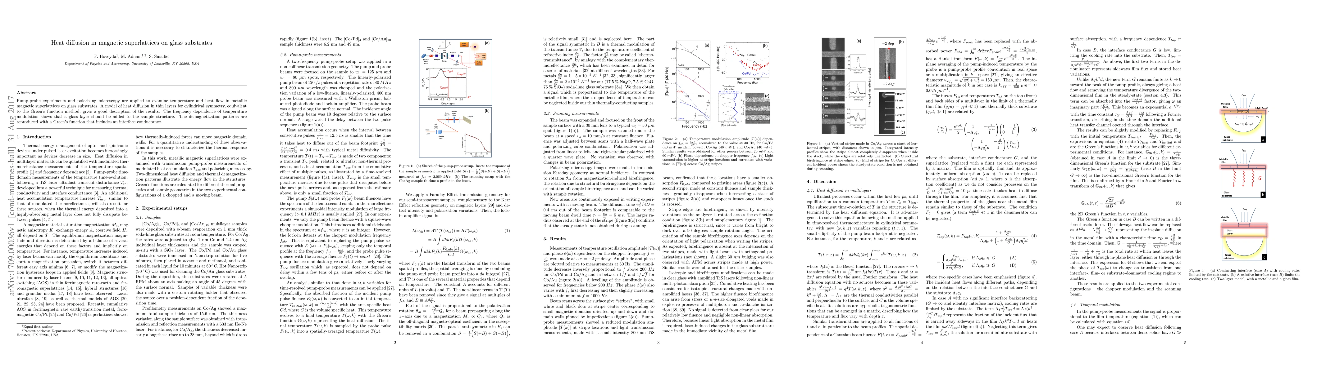 This research uses pump-probe experiments and polarizing microscopy to study heat diffusion in metallic magnetic superlattices on glass. Results align with a Green's function model, indicating glass layer necessity for temperature modulation frequency dependence. Demagnetization patterns are explained by an interface conductance-inclusive Green's function.