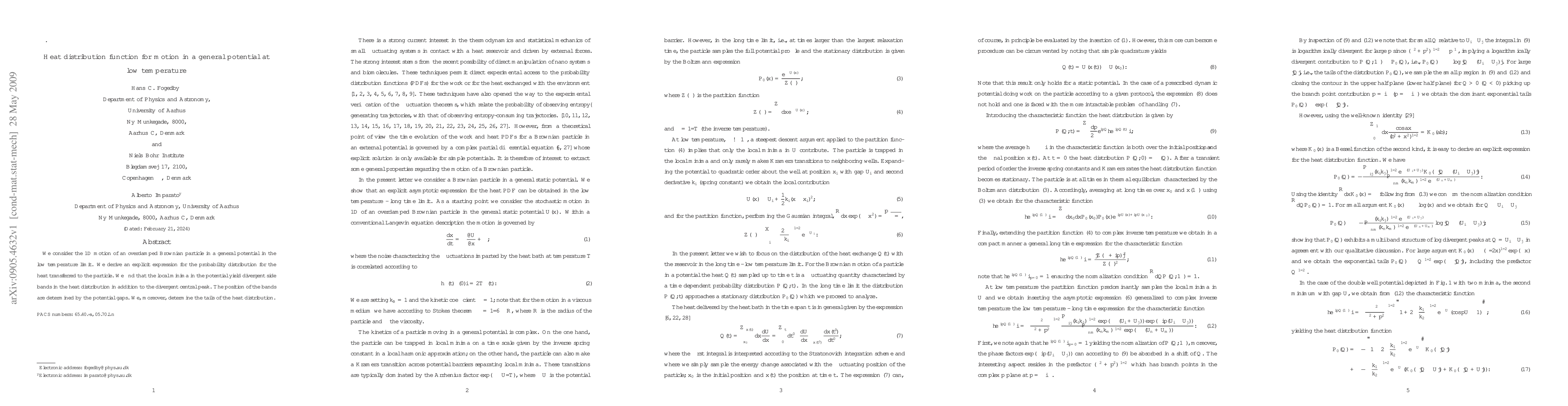 We consider the 1D motion of an overdamped Brownian particle in a general potential in the low temperature limit. We derive an explicit expression for the probability distribution for the heat transferred to the particle. We find that the local minima in the potential yield divergent side bands in the heat distribution in addition to the divergent central peak. The position of the bands are determined by the potential gaps. We, moreover, determine the tails of the heat distribution.