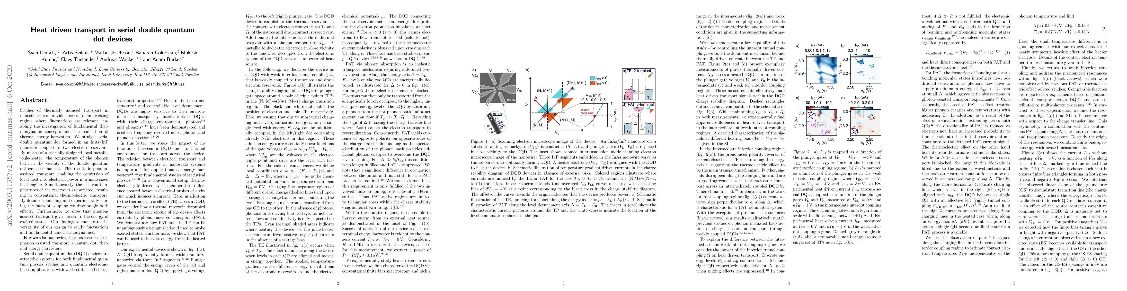 This paper investigates thermally induced transport in a serial double quantum dot embedded in a nanowire, where a local metallic heater enhances phonon-assisted transport. The study disentangles phonon-assisted transport from conventional thermoelectric effects and demonstrates the potential of the setup for nano-sized thermal energy harvesting and exploration of fundamental nanothermodynamics.