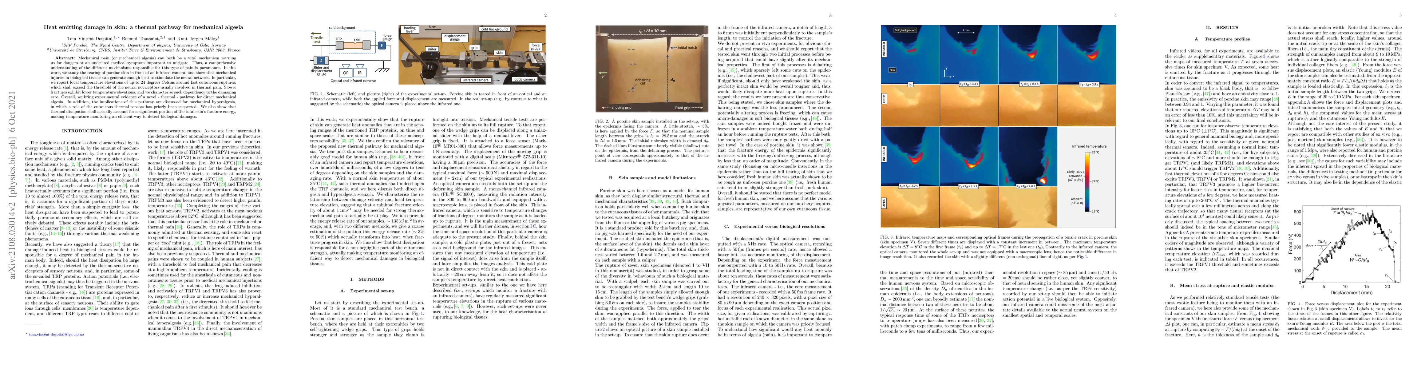 Mechanical pain (or mechanical algesia) can both be a vital mechanism warning us for dangers or an undesired medical symptom important to mitigate. Thus, a comprehensive understanding of the different mechanisms of this type of pain is paramount. In this work, we study the tearing of porcine skin in front of an infrared camera, and show that mechanical injuries in biological tissues can generate enough heat to stimulate the neural network. In particular, we report local temperature elevations of up to 24 degrees Celsius around fast cutaneous ruptures, which shall exceed the threshold of the neural nociceptors usually involved in thermal pain. Slower fractures exhibit lower temperature elevations, and we characterise such dependency to the damaging rate. Overall, we bring experimental evidence of a novel - thermal - pathway for direct mechanical algesia. In addition, the implications of this pathway are discussed for mechanical hyperalgesia as well, in which a role of the cutaneous thermal sensors has long been suspected. We also show that thermal dissipation shall actually account for a significant portion of the total skin's fracture energy, making temperature monitoring an efficient way to detect biological damages.