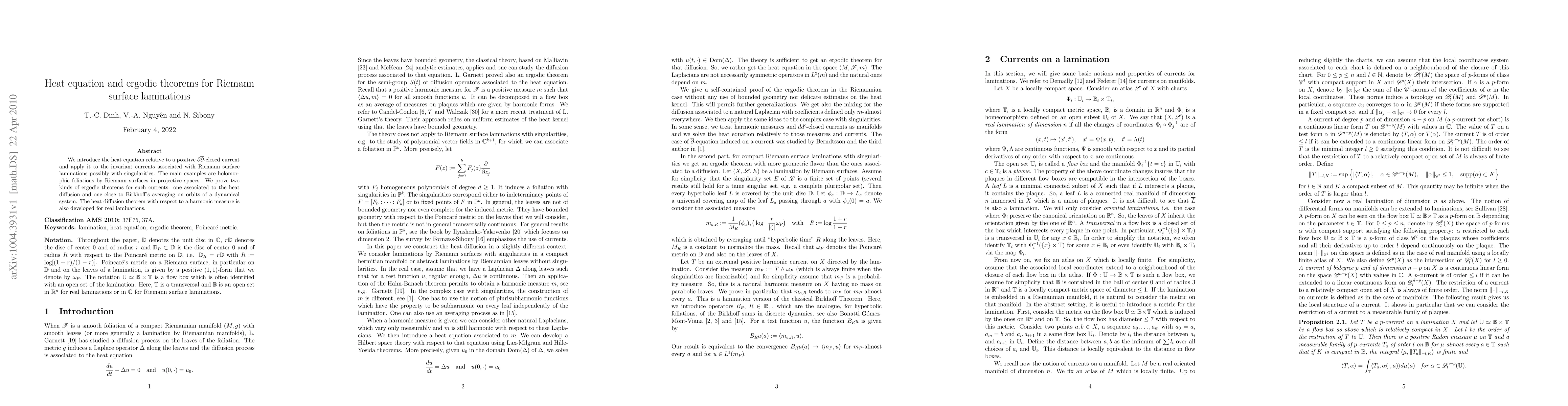 This paper introduces a heat equation relative to a positive dd-bar-closed current and applies it to invariant currents associated with Riemann surface laminations, proving ergodic theorems similar to Birkhoff's averaging and heat diffusion theorems for such currents.