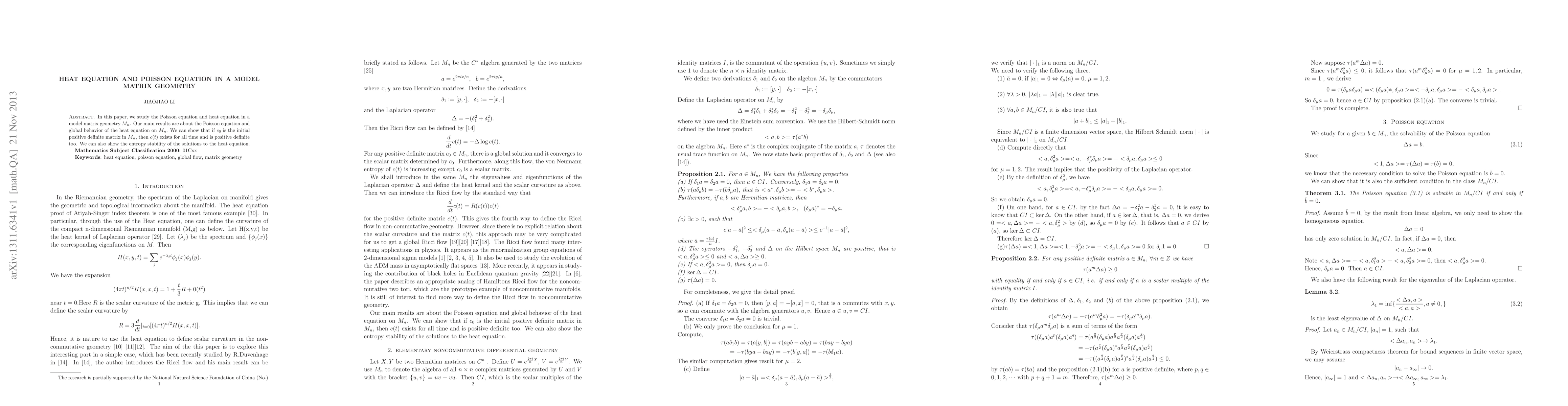 In this paper, we study the Poisson equation and heat equation in a model matrix geometry $M_n$. Our main results are about the Poisson equation and global behavior of the heat equation on $M_n$. We can show that if $c_0$ is the initial positive definite matrix in $M_n$, then $c(t)$ exists for all time and is positive definite too. We can also show the entropy stability of the solutions to the heat equation.