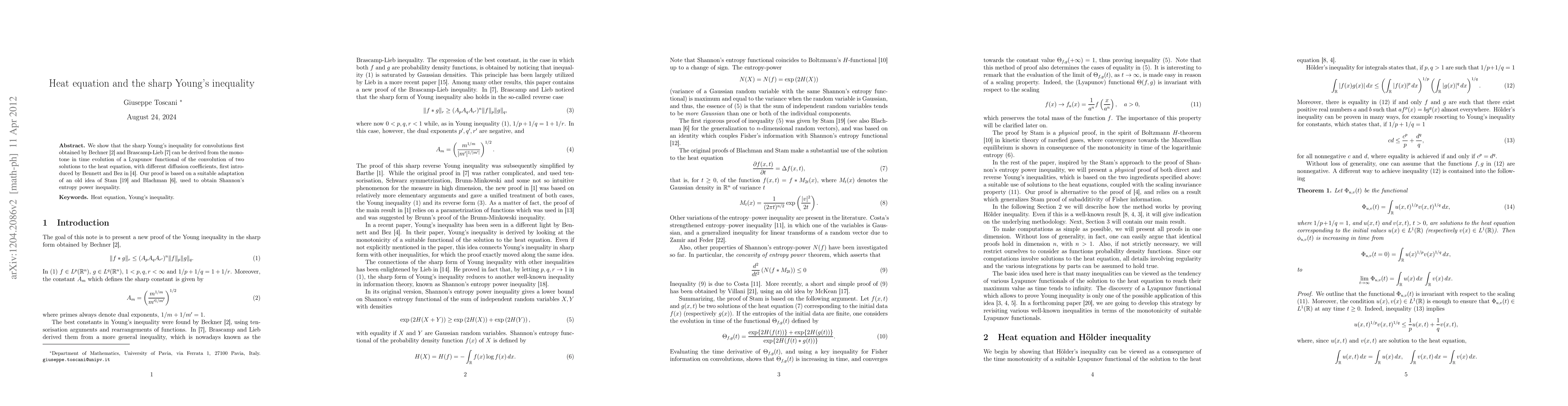 This paper demonstrates that the sharp Young's inequality for convolutions can be derived from the time-monotonic evolution of a Lyapunov functional linked to solutions of the heat equation with different diffusion coefficients. The proof employs an adapted version of Stam and Blachman's method, originally used to establish Shannon's entropy power inequality.