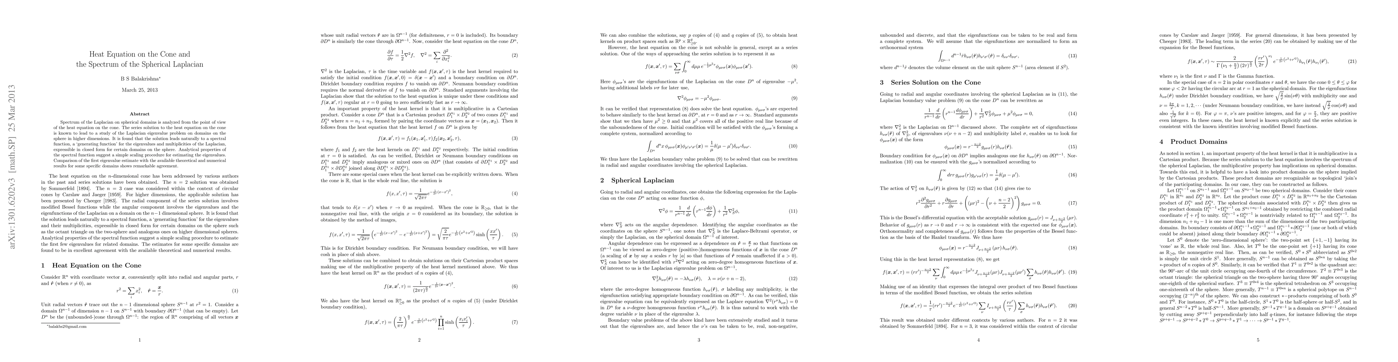 Spectrum of the Laplacian on spherical domains is analyzed from the point of view of the heat equation on the cone. The series solution to the heat equation on the cone is known to lead to a study of the Laplacian eigenvalue problem on domains on the sphere in higher dimensions. It is found that the solution leads naturally to a spectral function, a `generating function' for the eigenvalues and multiplicities of the Laplacian, expressible in closed form for certain domains on the sphere. Analytical properties of the spectral function suggest a simple scaling procedure for estimating the eigenvalues. Comparison of the first eigenvalue estimate with the available theoretical and numerical results for some specific domains shows remarkable agreement.