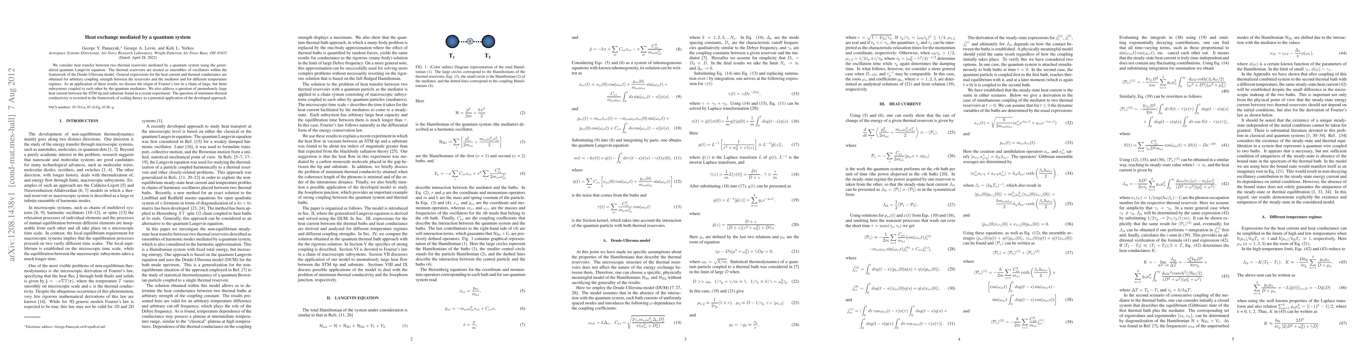 We consider heat transfer between two thermal reservoirs mediated by a quantum system using the generalized quantum Langevin equation. The thermal reservoirs are treated as ensembles of oscillators within the framework of the Drude-Ullersma model. General expressions for the heat current and thermal conductance are obtained for arbitrary coupling strength between the reservoirs and the mediator and for different temperature regimes. As an application of these results we discuss the origin of Fourier's law in a chain of large, but finite subsystems coupled to each other by the quantum mediators. We also address a question of anomalously large heat current between the STM tip and substrate found in a recent experiment. The question of minimum thermal conductivity is revisited in the framework of scaling theory as a potential application of the developed approach.