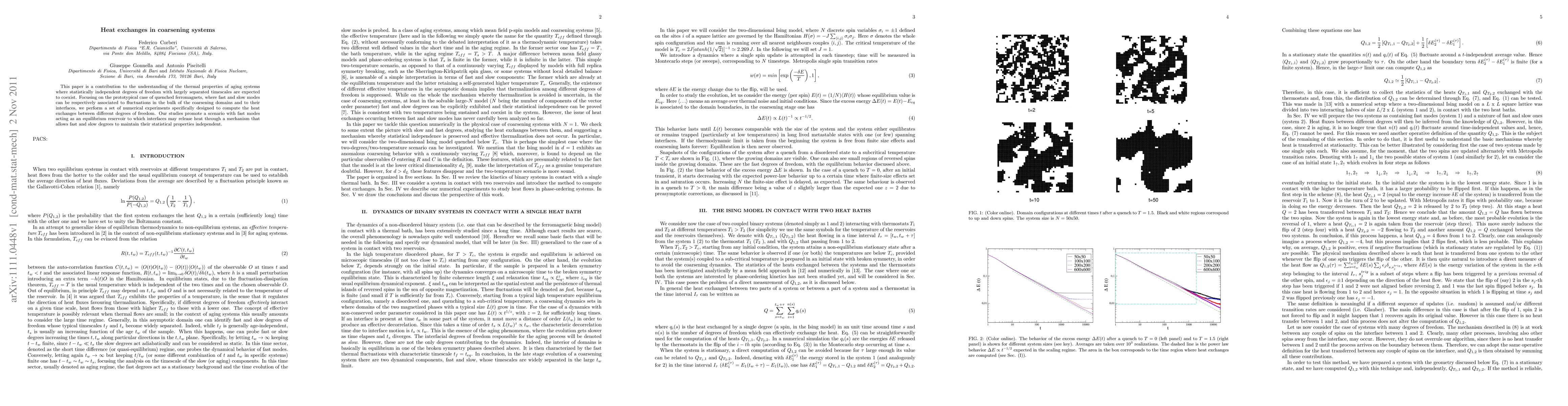 This paper is a contribution to the understanding of the thermal properties of aging systems where statistically independent degrees of freedom with largely separated timescales are expected to coexist. Focusing on the prototypical case of quenched ferromagnets, where fast and slow modes can be respectively associated to fluctuations in the bulk of the coarsening domains and to their interfaces, we perform a set of numerical experiments specifically designed to compute the heat exchanges between different degrees of freedom. Our studies promote a scenario with fast modes acting as an equilibrium reservoir to which interfaces may release heat through a mechanism that allows fast and slow degrees to maintain their statistical properties independent.