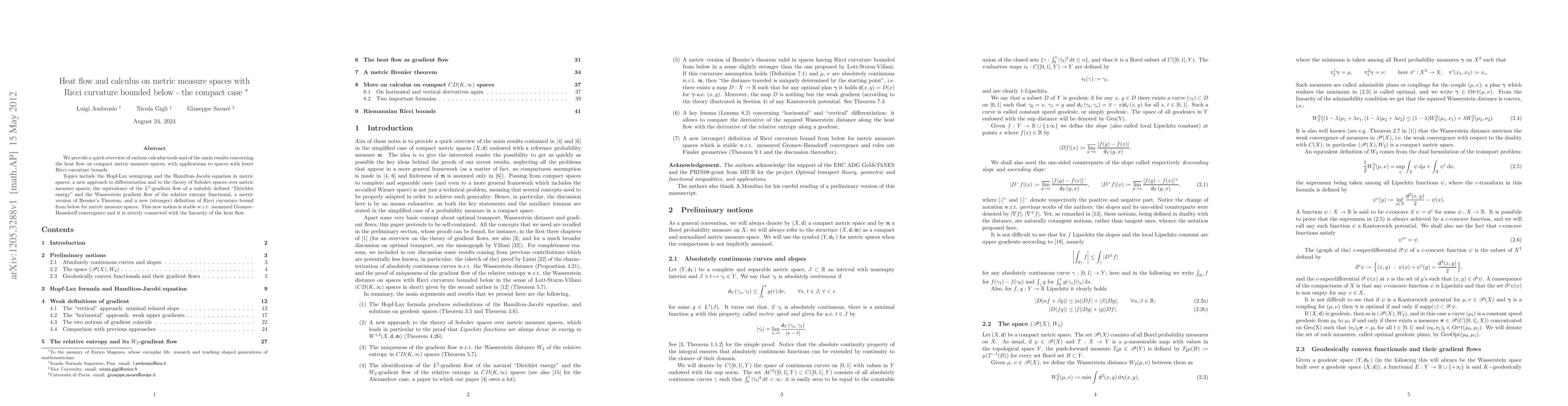 We provide a quick overview of various calculus tools and of the main results concerning the heat flow on compact metric measure spaces, with applications to spaces with lower Ricci curvature bounds. Topics include the Hopf-Lax semigroup and the Hamilton-Jacobi equation in metric spaces, a new approach to differentiation and to the theory of Sobolev spaces over metric measure spaces, the equivalence of the L^2-gradient flow of a suitably defined "Dirichlet energy" and the Wasserstein gradient flow of the relative entropy functional, a metric version of Brenier's Theorem, and a new (stronger) definition of Ricci curvature bound from below for metric measure spaces. This new notion is stable w.r.t. measured Gromov-Hausdorff convergence and it is strictly connected with the linearity of the heat flow.