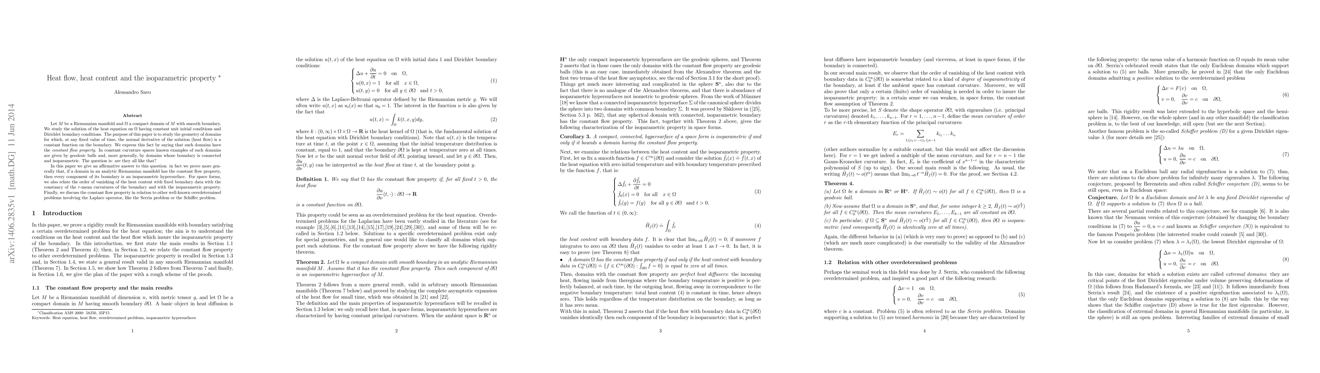Let $M$ be a Riemannian manifold and $\Omega$ a compact domain of $M$ with smooth boundary. We study the solution of the heat equation on $\Omega$ having constant unit initial conditions and Dirichlet boundary conditions. The purpose of this paper is to study the geometry of domains for which, at any fixed value of time, the normal derivative of the solution (heat flow) is a constant function on the boundary. We express this fact by saying that such domains have the constant flow property. In constant curvature spaces known examples of such domains are given by geodesic balls and, more generally, by domains whose boundary is connected and isoparametric. The question is: are they all like that? In this paper we give an affirmative answer to this question: in fact we prove more generally that, if a domain in an analytic Riemannian manifold has the constant flow property, then every component of its boundary is an isoparametric hypersurface. For space forms, we also relate the order of vanishing of the heat content with fixed boundary data with the constancy of the $r$-mean curvatures of the boundary and with the isoparametric property. Finally, we discuss the constant flow property in relation to other well-known overdetermined problems involving the Laplace operator, like the Serrin problem or the Schiffer problem.