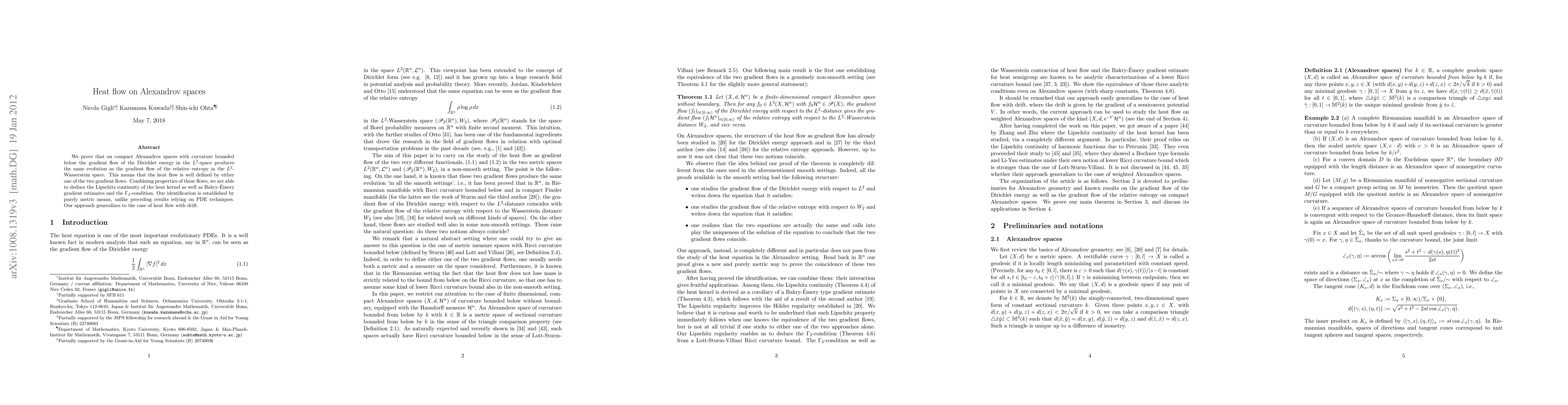 We prove that on compact Alexandrov spaces with curvature bounded below the gradient flow of the Dirichlet energy in the $L^2$-space produces the same evolution as the gradient flow of the relative entropy in the $L^2$-Wasserstein space. This means that the heat flow is well defined by either one of the two gradient flows. Combining properties of these flows, we are able to deduce the Lipschitz continuity of the heat kernel as well as Bakry-\'Emery gradient estimates and the $\Gamma_2$-condition. Our identification is established by purely metric means, unlike preceding results relying on PDE techniques. Our approach generalizes to the case of heat flow with drift.