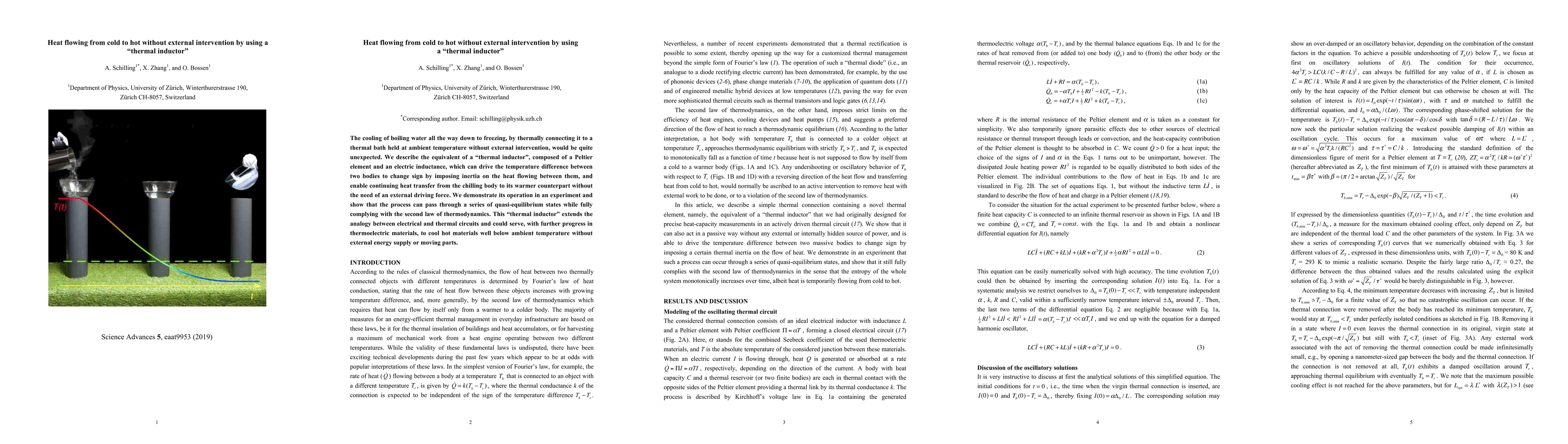 This paper introduces a 'thermal inductor' that enables heat to flow from cold to hot without external intervention, using a combination of a Peltier element and electric inductance to reverse the temperature gradient. The experiment demonstrates compliance with the second law of thermodynamics and suggests potential applications in cooling materials below ambient temperature.