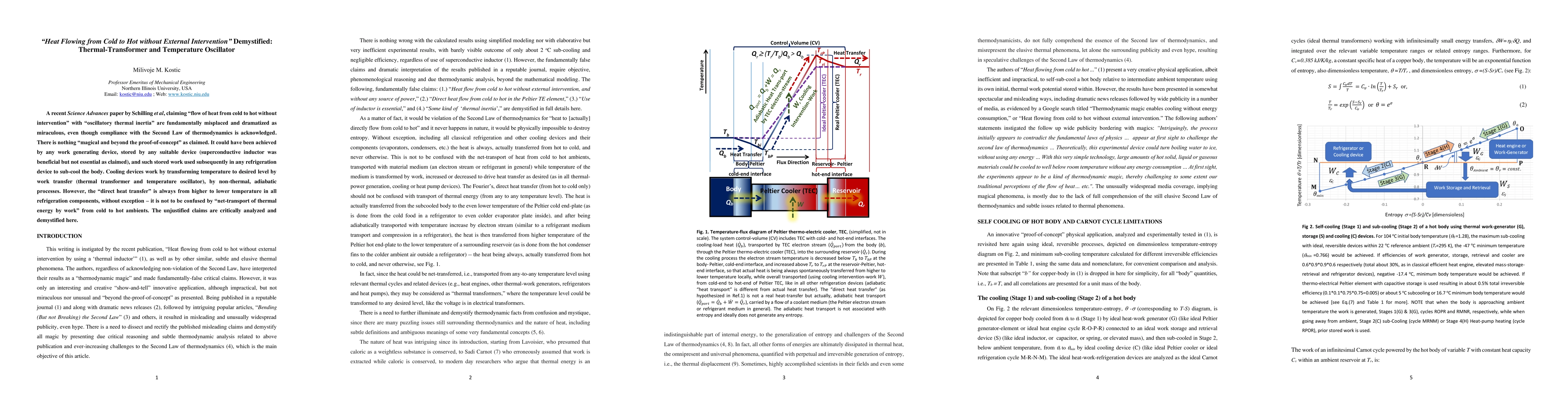 A recent Science Advances paper by Schilling et al, claiming "flow of heat from cold to hot without intervention" with "oscillatory thermal inertia" are fundamentally misplaced and dramatized as miraculous, even though compliance with the Second Law of thermodynamics is acknowledged. There is nothing "magical and beyond the proof-of-concept" as claimed. It could have been achieved by any work generating device, stored by any suitable device (superconductive inductor was beneficial but not essential as claimed), and such stored work used subsequently in any refrigeration device to sub-cool the body. Cooling devices work by transforming temperature to desired level by work transfer (thermal transformer and temperature oscillator), by non-thermal, adiabatic processes. However, the "direct heat transfer" is always from higher to lower temperature in all refrigeration components, without exception - it is not to be confused by "net-transport of thermal energy by work" from cold to hot ambients. The unjustified claims are critically analyzed and demystified here.
