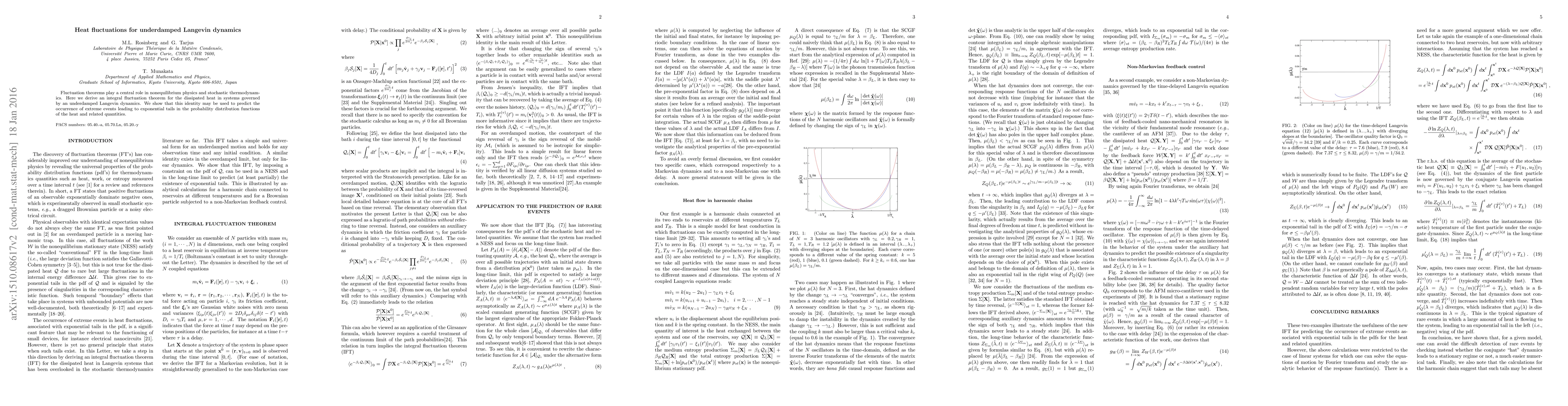 This paper derives an integral fluctuation theorem for dissipated heat in underdamped Langevin dynamics, demonstrating its utility in predicting extreme events and the resulting exponential tails in the probability distributions of heat and related quantities.