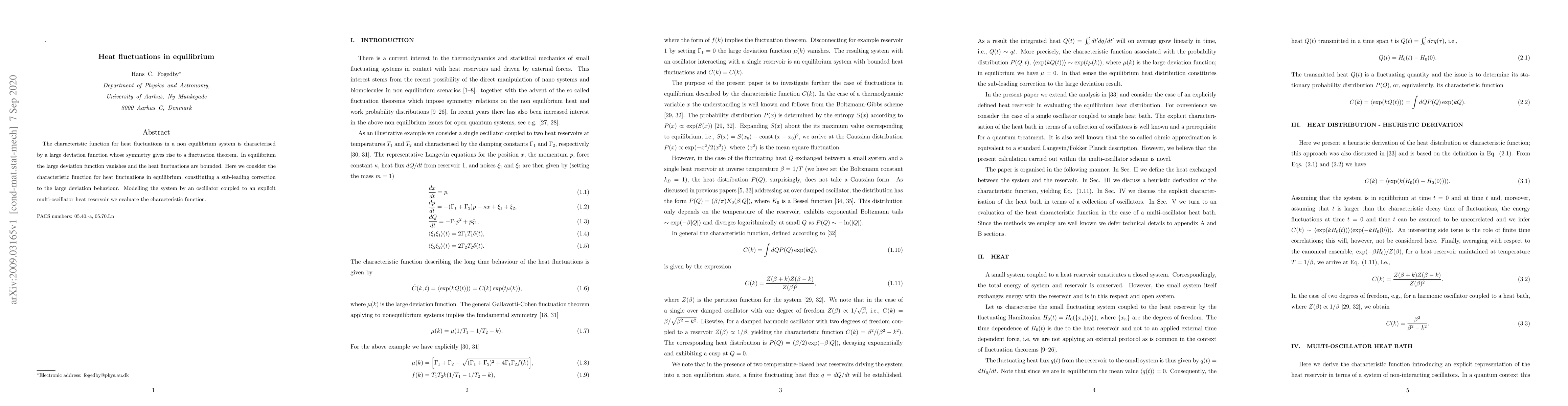This paper investigates the characteristic function for heat fluctuations in equilibrium, revealing a sub-leading correction to large deviation behavior. The study models the system as an oscillator coupled to a multi-oscillator heat reservoir to evaluate this function.