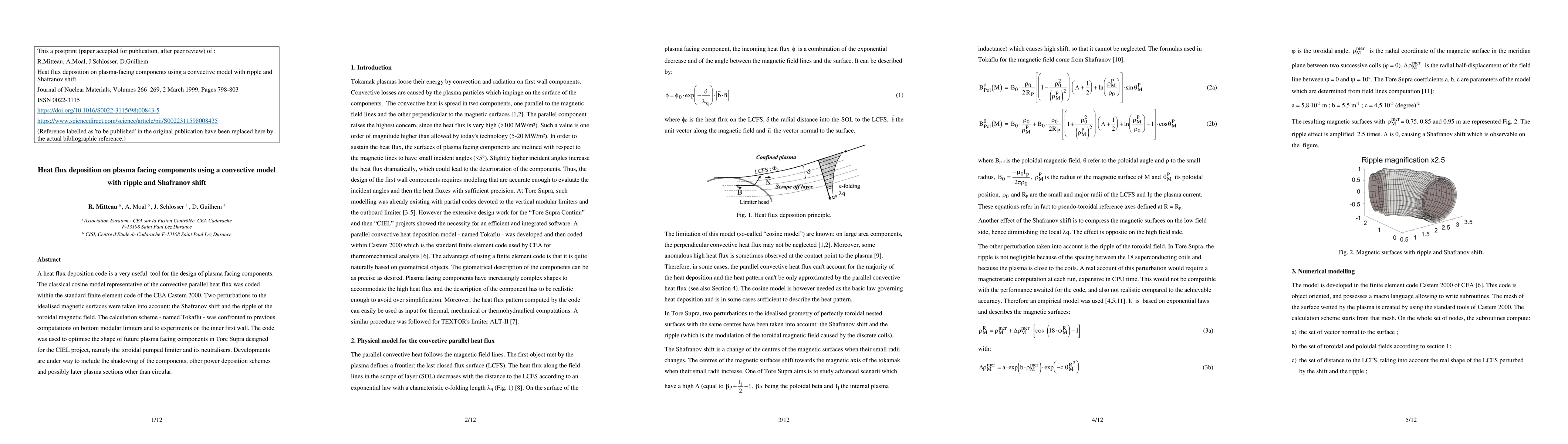 This paper presents a heat flux deposition code named Tokaflu, which incorporates convective parallel heat flux and accounts for magnetic perturbations like Shafranov shift and toroidal magnetic field ripple. The code was used to optimize plasma-facing components for the CIEL project in Tore Supra.