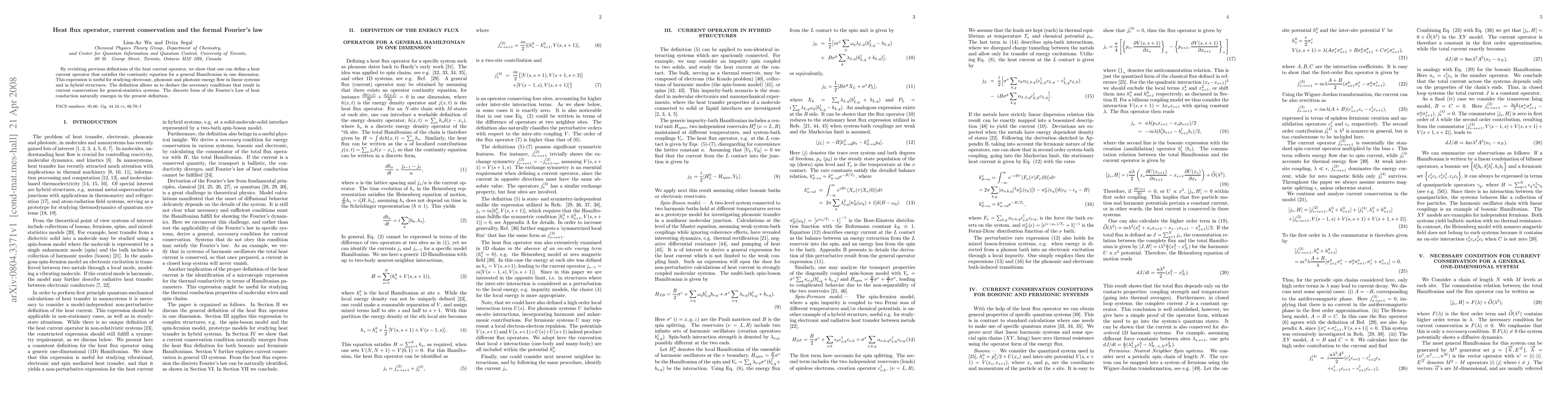 This paper redefines the heat current operator to satisfy the continuity equation for a general Hamiltonian in one dimension, facilitating studies on energy flow in various systems. It also deduces conditions for current conservation and shows the emergence of the discrete Fourier's law from this new definition.