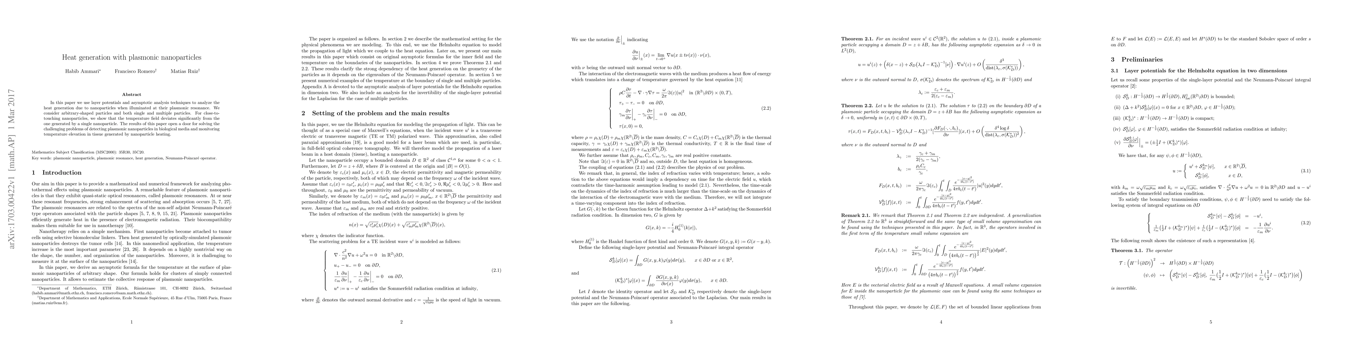 This paper analyzes heat generation from plasmonic nanoparticles using layer potentials and asymptotic analysis, revealing significant temperature field deviations for close-to-touching particles. The findings advance methods for detecting nanoparticles in biological media and monitoring tissue heating.