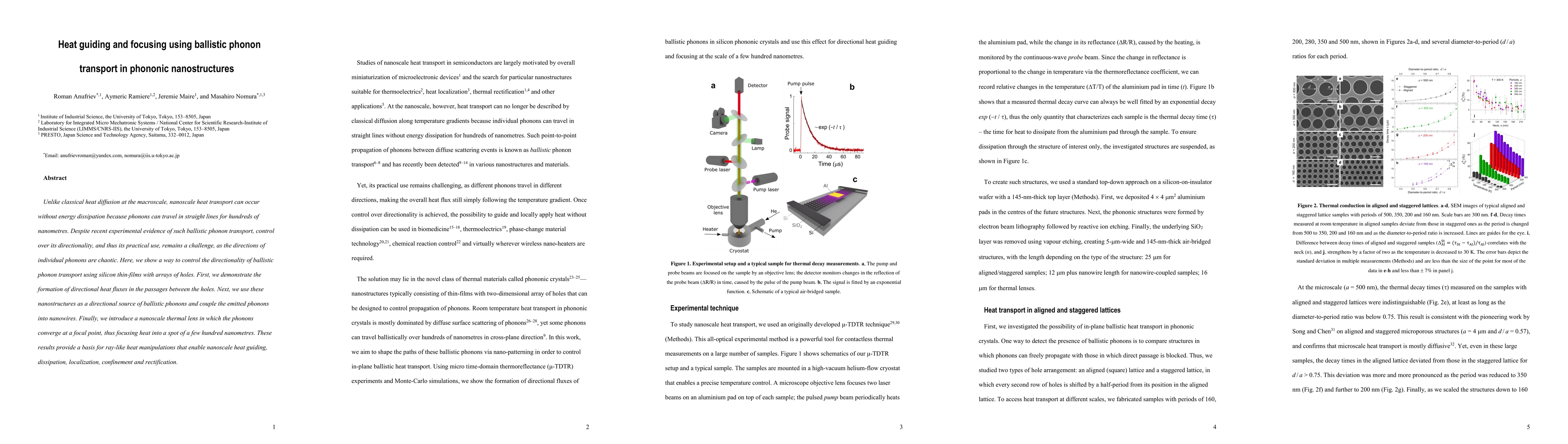 This paper demonstrates control over ballistic phonon transport in silicon nanostructures, enabling directional heat fluxes, phonon coupling into nanowires, and nanoscale thermal lensing for precise heat focusing. These innovations enable advanced nanoscale heat manipulation techniques.