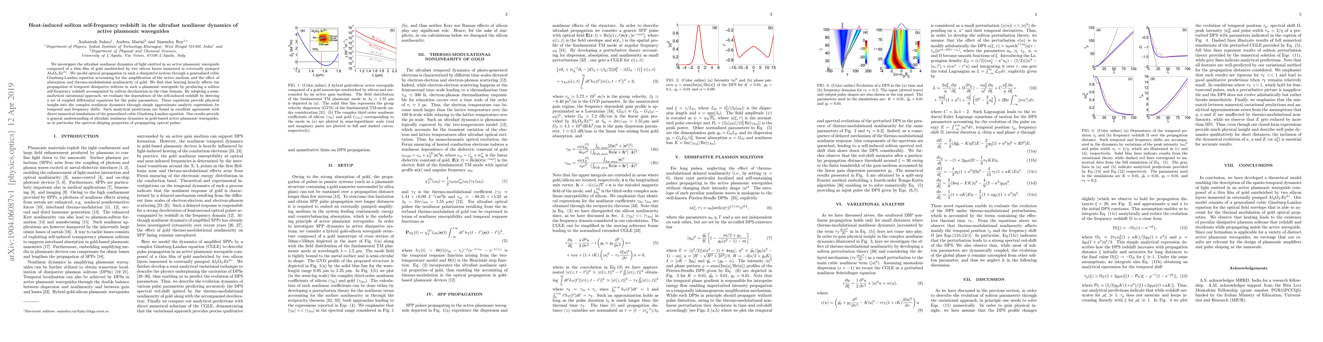 This research explores the ultrafast nonlinear dynamics in active plasmonic waveguides, demonstrating that heat induces soliton self-frequency redshift and deceleration due to thermo-modulational nonlinearity in gold, validated by semi-analytical and numerical methods.