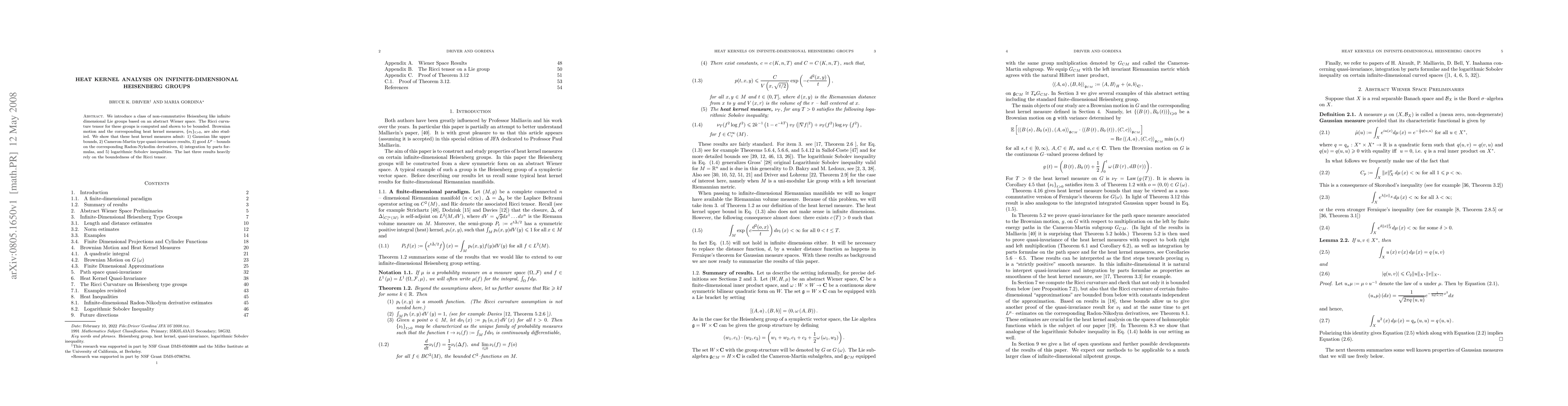 We introduce a class of non-commutative Heisenberg like infinite dimensional Lie groups based on an abstract Wiener space. The Ricci curvature tensor for these groups is computed and shown to be bounded. Brownian motion and the corresponding heat kernel measures, $\{\nu_t\}_{t>0},$ are also studied. We show that these heat kernel measures admit: 1) Gaussian like upper bounds, 2) Cameron-Martin type quasi-invariance results, 3) good $L^p$ -- bounds on the corresponding Radon-Nykodim derivatives, 4) integration by parts formulas, and 5) logarithmic Sobolev inequalities. The last three results heavily rely on the boundedness of the Ricci tensor.