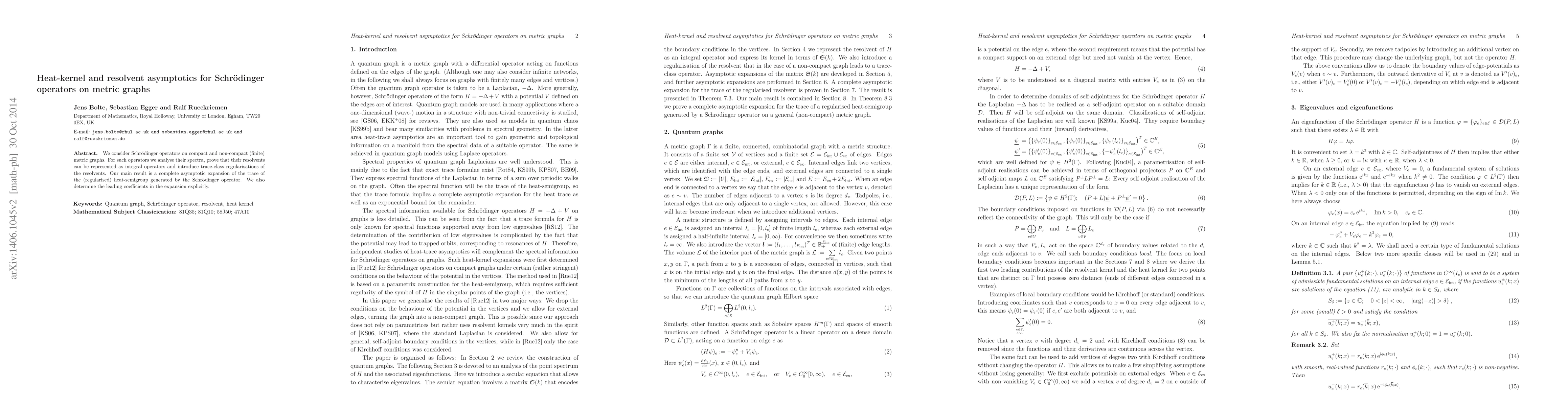 This paper studies Schrödinger operators on metric graphs, proving that their resolvents can be represented as integral operators and introducing trace-class regularisations. The main result is a complete asymptotic expansion of the trace of the heat-semigroup generated by these operators, with explicit determination of leading coefficients.