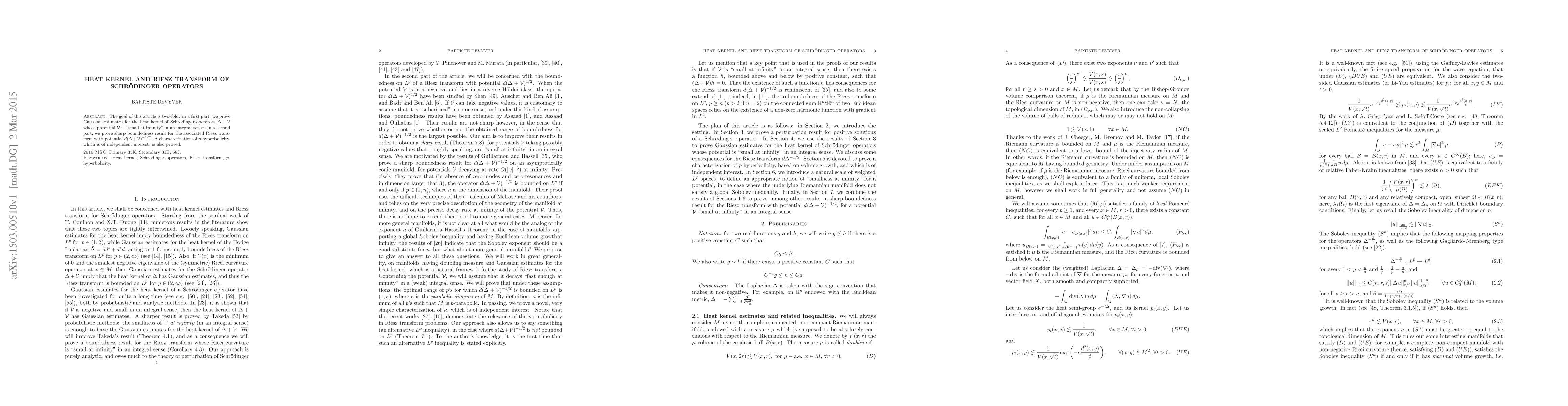 The work combines insights from heat kernel theory, Riesz transform analysis, and p-hyperbolicity characterization, offering a comprehensive approach to Schrödinger operator studies under integral smallness conditions at infinity.