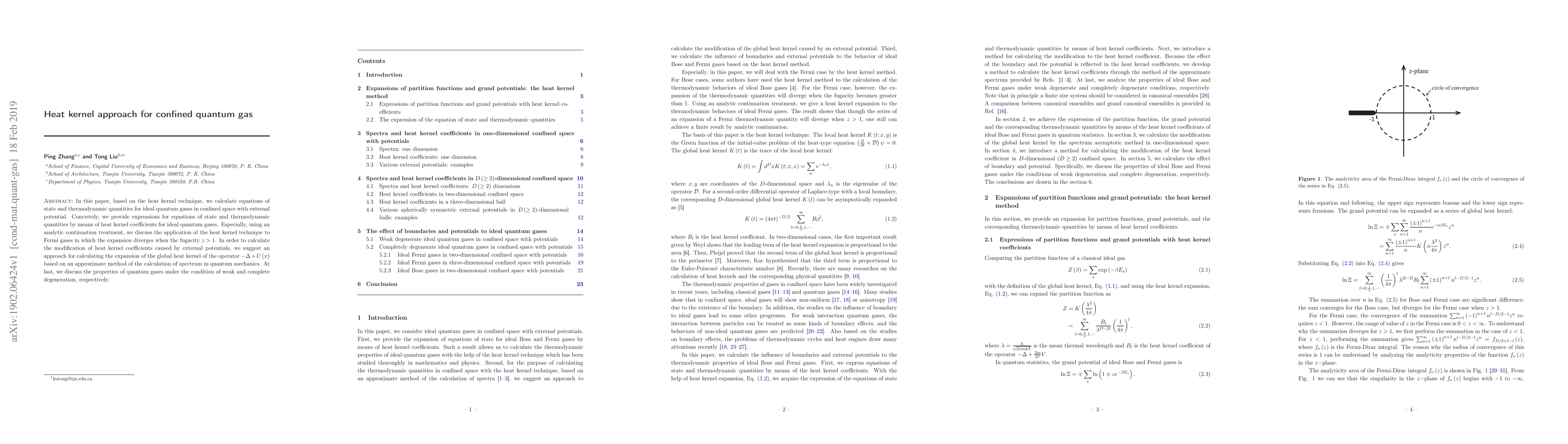 This paper employs the heat kernel technique to derive equations of state and thermodynamic quantities for ideal quantum gases in confined spaces with external potentials. It particularly addresses the application of this method to Fermi gases, providing an analytic continuation treatment to handle divergent expansions when the fugacity exceeds unity.