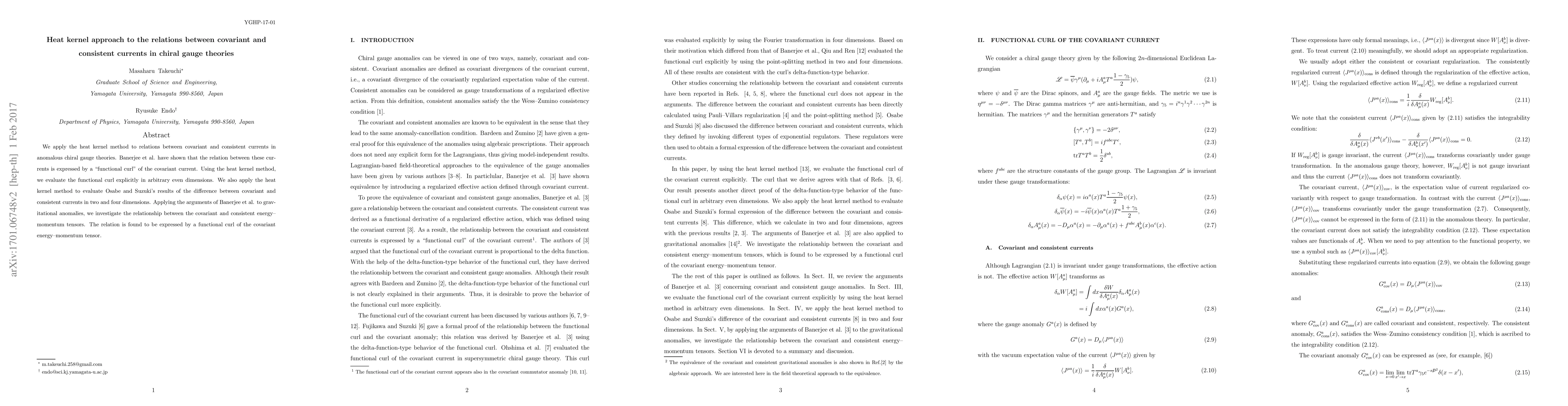 Researchers used the heat kernel method to study relations between covariant and consistent currents in chiral gauge theories, finding a functional curl that expresses these connections.