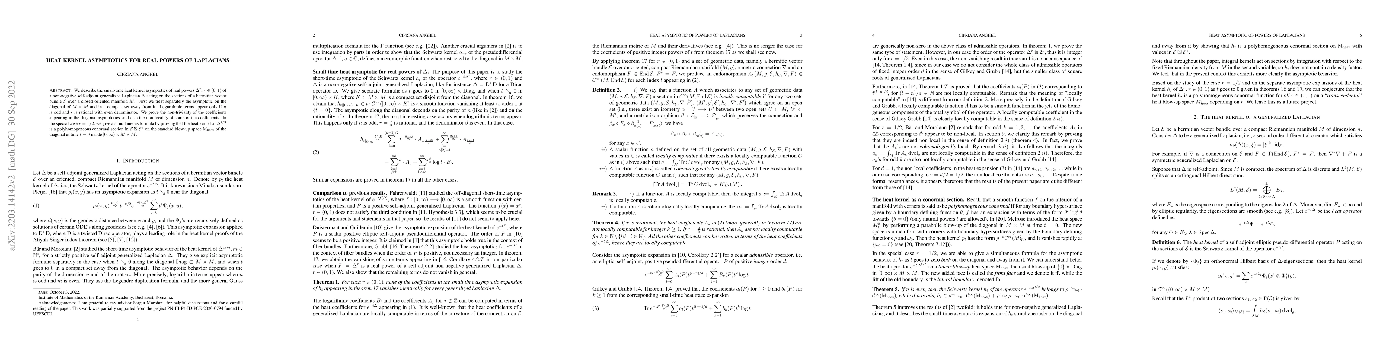 This paper investigates the small-time asymptotics of heat kernels for real powers of the Laplacian on a closed manifold, distinguishing between diagonal and off-diagonal behaviors. Logarithmic terms arise under specific conditions, and coefficients in the diagonal asymptotics are shown to be non-trivial and non-local.