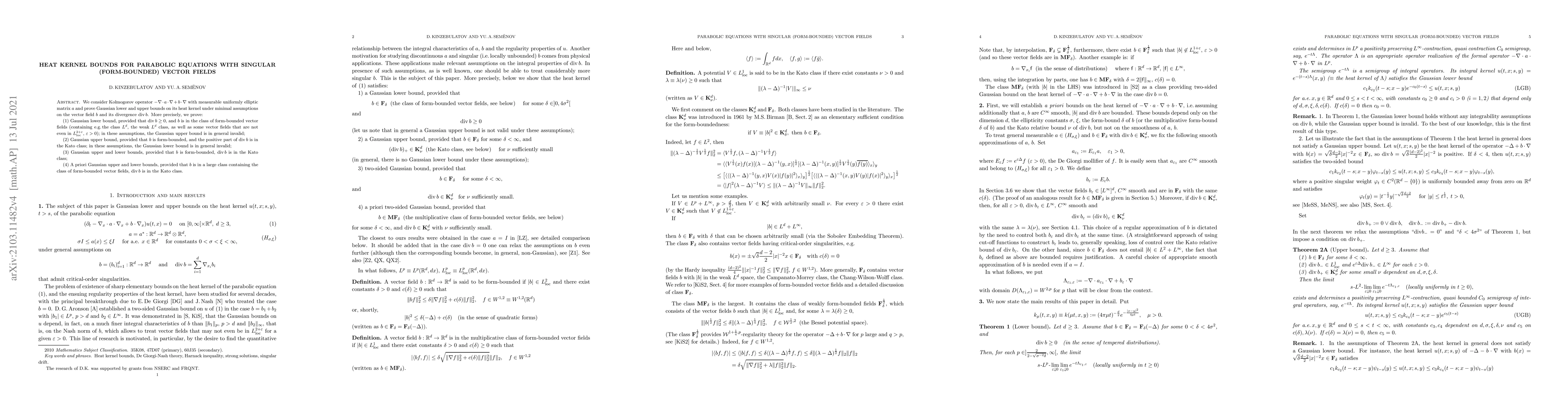 We consider Kolmogorov operator $-\nabla \cdot a \cdot \nabla + b \cdot \nabla$ with measurable uniformly elliptic matrix $a$ and prove Gaussian lower and upper bounds on its heat kernel under minimal assumptions on the vector field $b$ and its divergence ${\rm div\,}b$. More precisely, we prove: (1) Gaussian lower bound, provided that ${\rm div\,}b \geq 0$, and $b$ is in the class of form-bounded vector fields (containing e.g.\,the class $L^d$, the weak $L^d$ class, as well as some vector fields that are not even in $L_{\rm loc}^{2+\varepsilon}$, $\varepsilon>0$); in these assumptions, the Gaussian upper bound is in general invalid; (2) Gaussian upper bound, provided that $b$ is form-bounded, and the positive part of ${\rm div\,}b$ is in the Kato class; in these assumptions, the Gaussian lower bound is in general invalid; (3) Gaussian upper and lower bounds, provided that $b$ is form-bounded, ${\rm div\,}b$ is in the Kato class; (4) A priori Gaussian upper and lower bounds, provided that $b$ is in a large class containing the class of form-bounded vector fields, ${\rm div\,}b$ is in the Kato class.