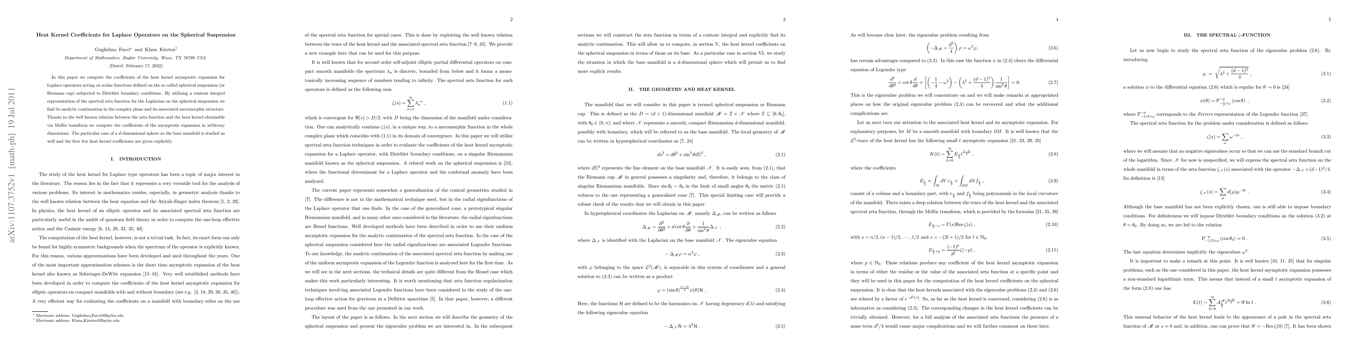 This paper computes heat kernel coefficients for Laplace operators on spherical suspensions with Dirichlet boundary conditions using spectral zeta function and contour integral techniques, providing an analytic continuation and meromorphic structure in complex dimensions, and explicitly calculating coefficients for a $d$-dimensional sphere.