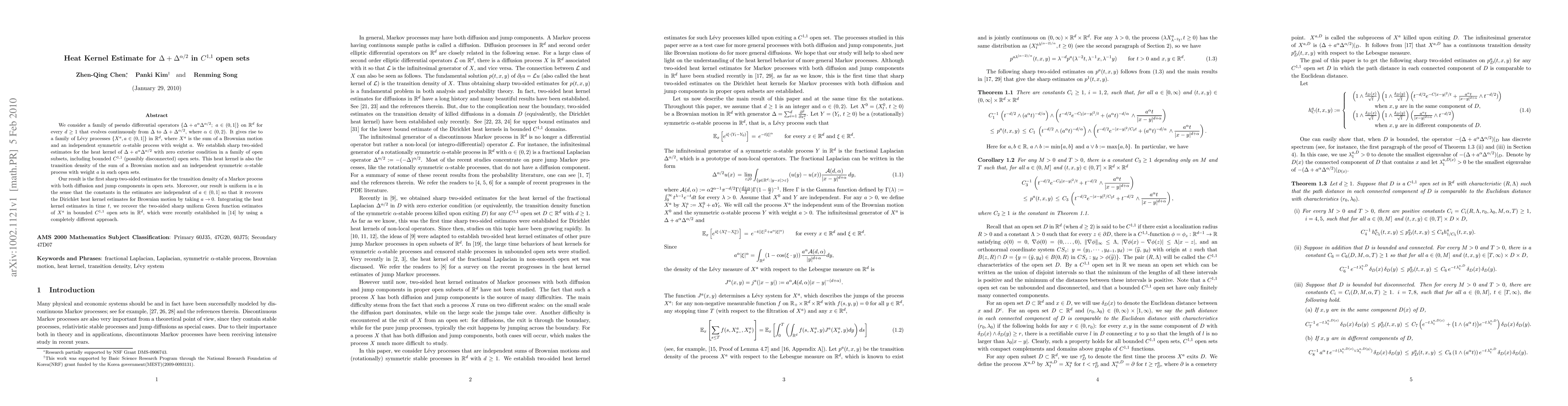 We consider a family of pseudo differential operators $\{\Delta+ a^\alpha \Delta^{\alpha/2}; a\in (0, 1]\}$ on $\bR^d$ for every $d\geq 1$ that evolves continuously from $\Delta$ to $\Delta + \Delta^{\alpha/2}$, where $\alpha \in (0, 2)$. It gives rise to a family of L\'evy processes $\{X^a, a\in (0, 1]\}$ in $\bR^d$, where $X^a$ is the sum of a Brownian motion and an independent symmetric $\alpha$-stable process with weight $a$. We establish sharp two-sided estimates for the heat kernel of $\Delta + a^{\alpha} \Delta^{\alpha/2}$ with zero exterior condition in a family of open subsets, including bounded $C^{1, 1}$ (possibly disconnected) open sets. This heat kernel is also the transition density of the sum of a Brownian motion and an independent symmetric $\alpha$-stable process with weight $a$ in such open sets. Our result is the first sharp two-sided estimates for the transition density of a Markov process with both diffusion and jump components in open sets. Moreover, our result is uniform in $a$ in the sense that the constants in the estimates are independent of $a\in (0, 1]$ so that it recovers the Dirichlet heat kernel estimates for Brownian motion by taking $a\to 0$. Integrating the heat kernel estimates in time $t$, we recover the two-sided sharp uniform Green function estimates of $X^a$ in bounded $C^{1,1}$ open sets in $\bR^d$, which were recently established in \cite{CKSV2} by using a completely different approach.