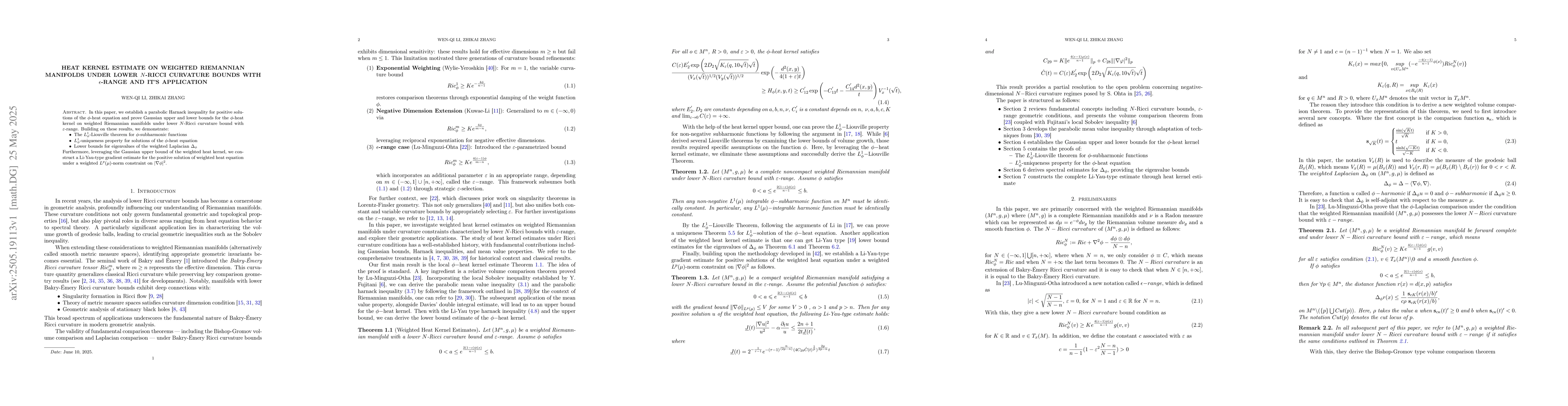 The paper presents a parabolic Harnack inequality and derives Gaussian bounds for the φ-heat kernel, along with several important theorems and estimates under specified curvature conditions.