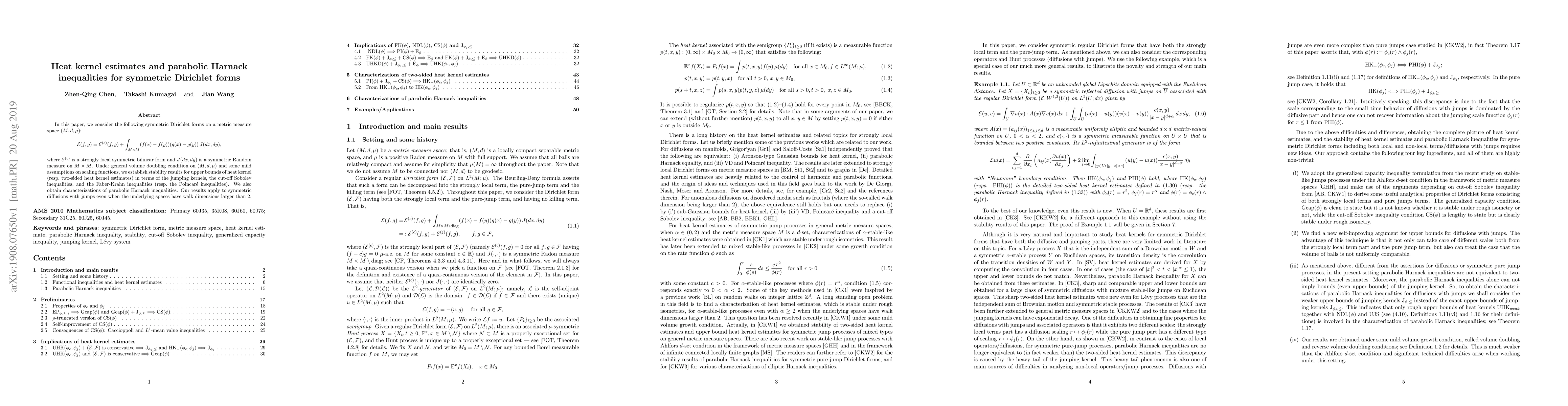 This paper establishes heat kernel estimates and parabolic Harnack inequalities for symmetric Dirichlet forms on metric measure spaces, under volume doubling conditions. It provides stability results linking heat kernels to jumping kernels and Sobolev inequalities, and characterizes parabolic Harnack inequalities for diffusions with jumps, applicable to spaces with dimensions greater than $2$.